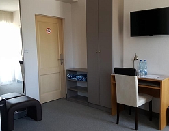 вешалка, зеркало, кровати односпальные /одна двуспальная кровать, прикроватные тумбочки, стол, шкаф