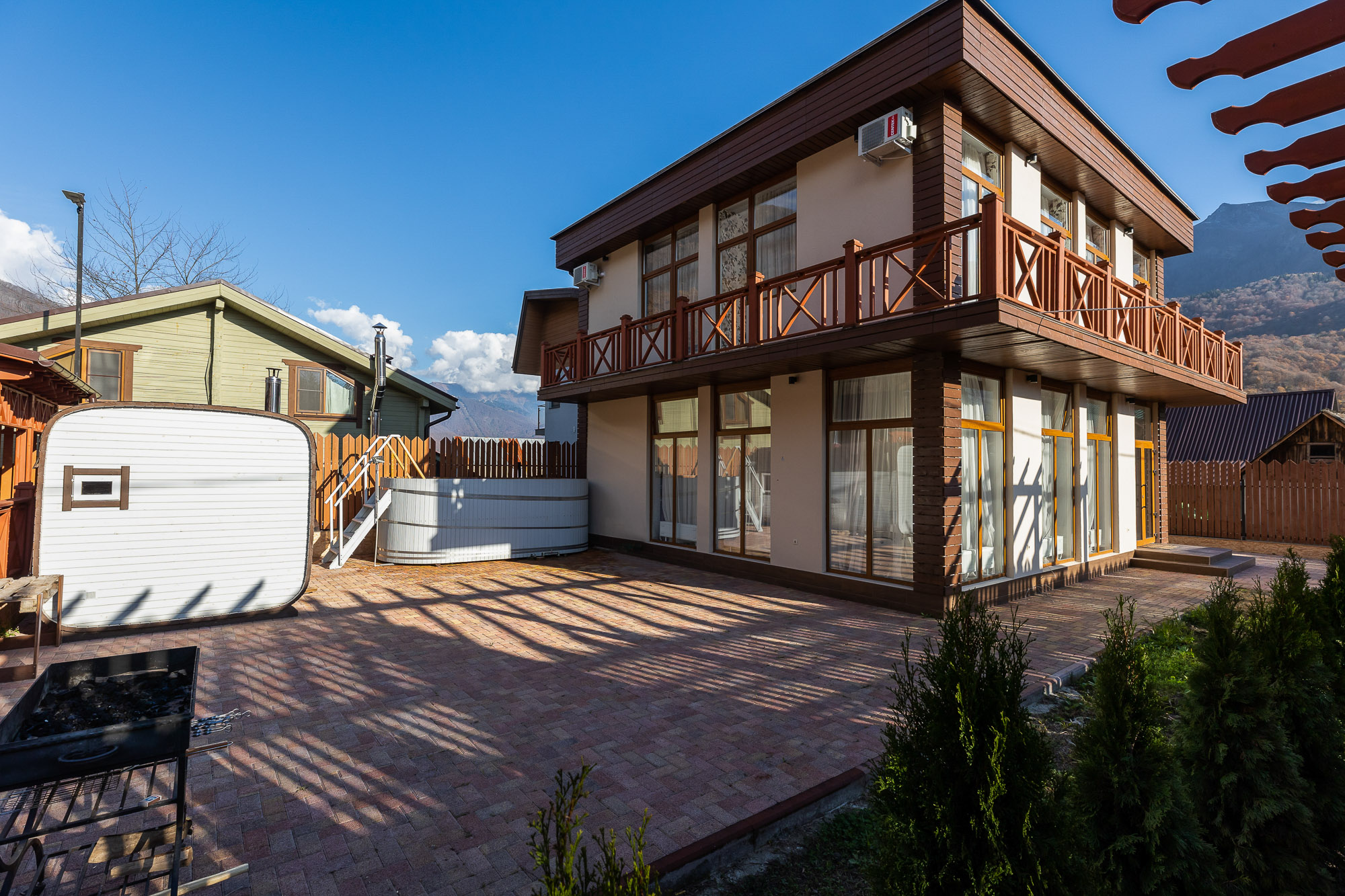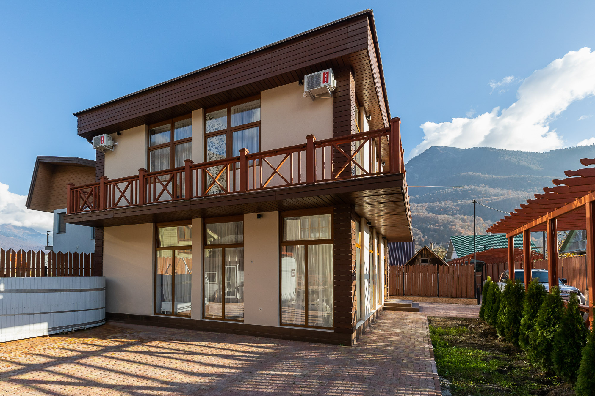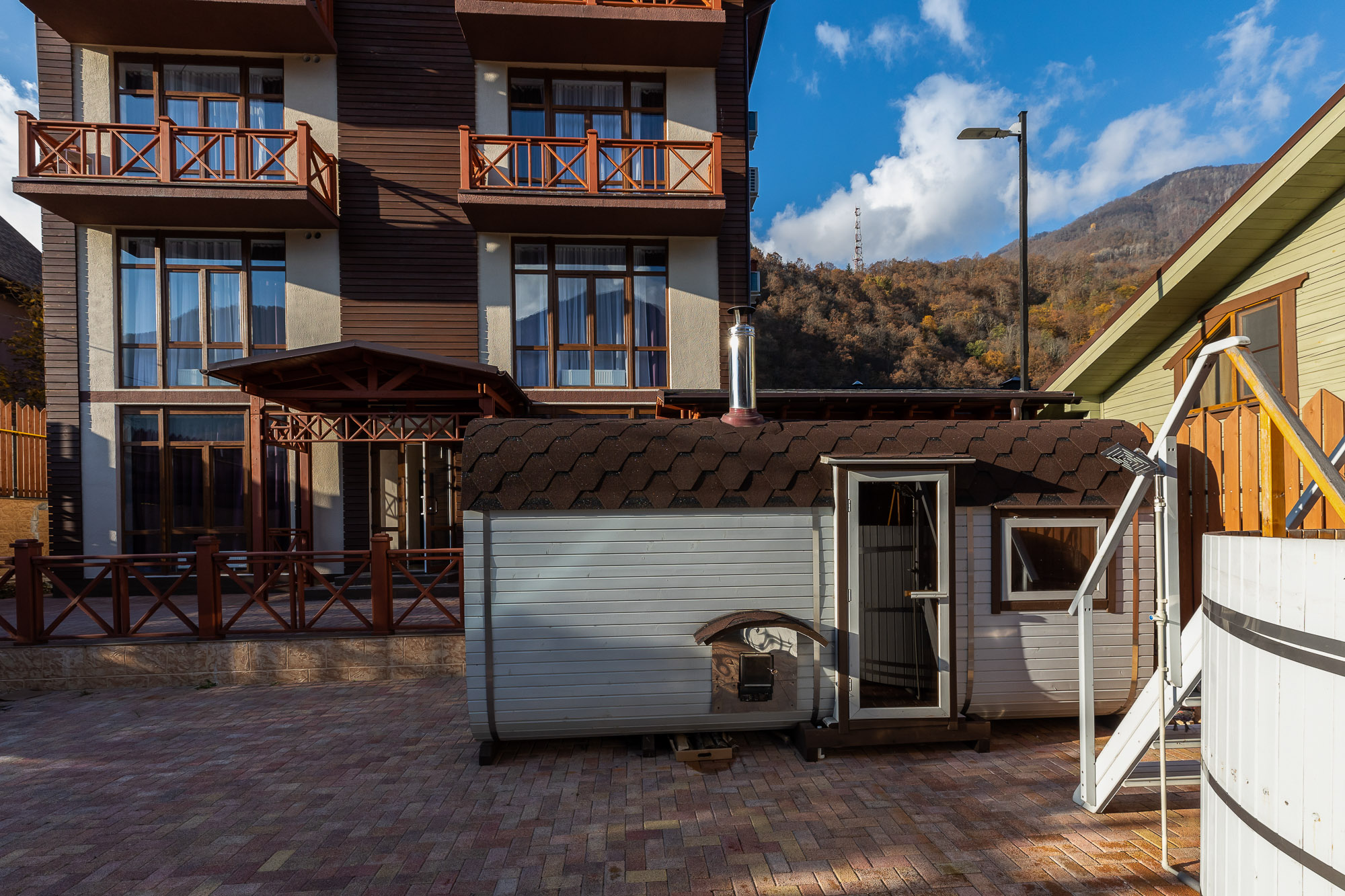 На закрытой благоустроенной территории располагаются трехэтажный корпус отеля и двухэтажная вилла для компаний, выстроенные с элементами фахверкового стиля. Жилой фонд включает в себя 24 современных комфортабельных номера. Каждый оснащен индивидуальной ванной комнатой с набором косметических принадлежностей для гостей, есть кондиционер и бытовая техника. В ряде номеров имеются панорамные окна и балконы, откуда открываются живописные виды на Кавказские горы.