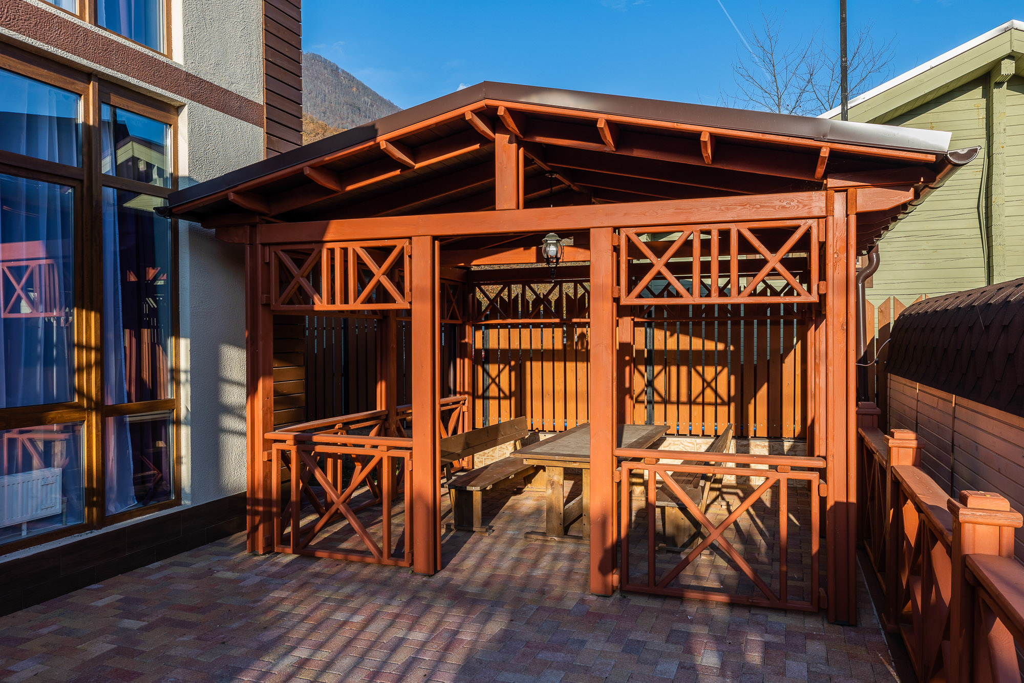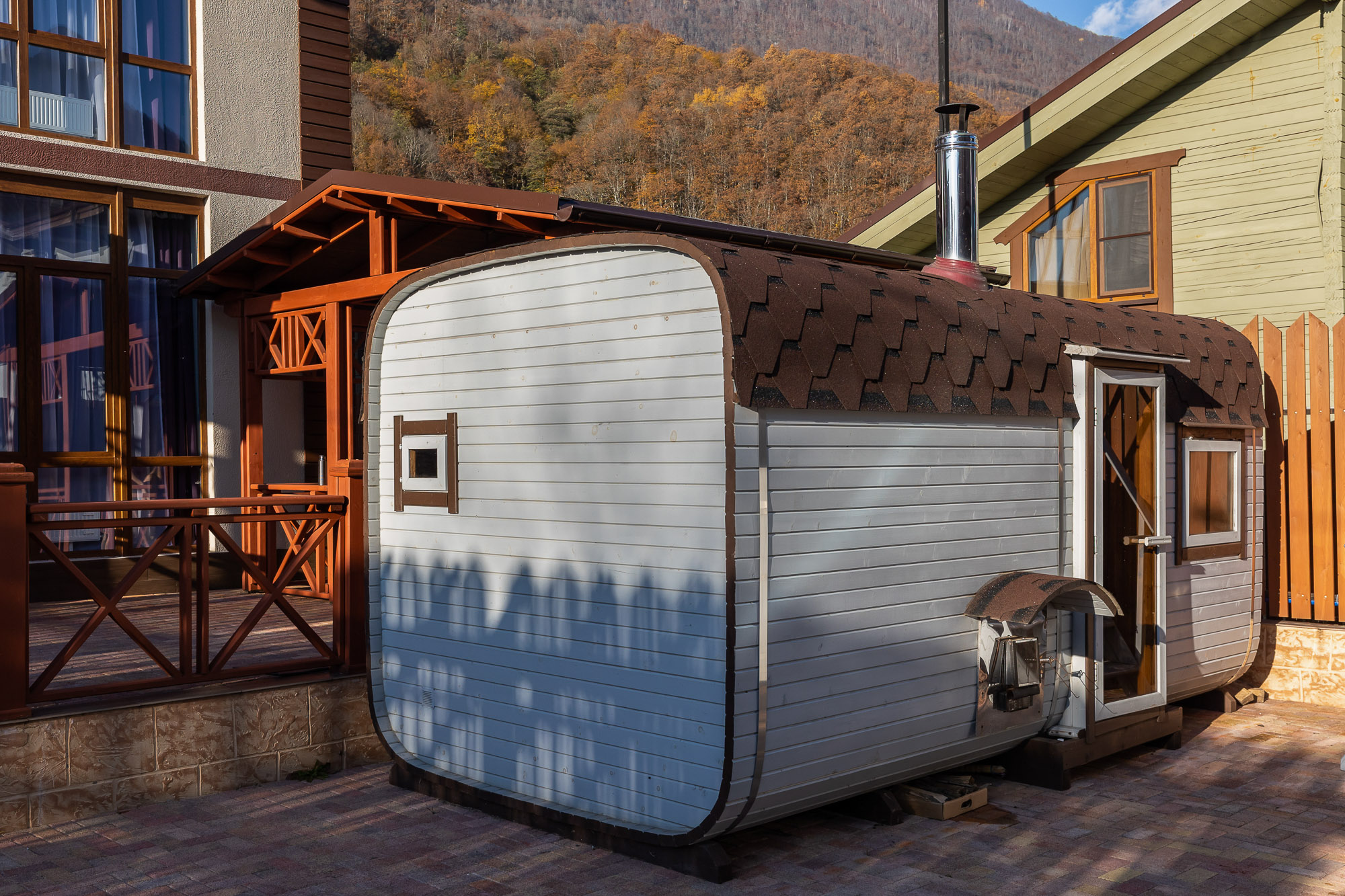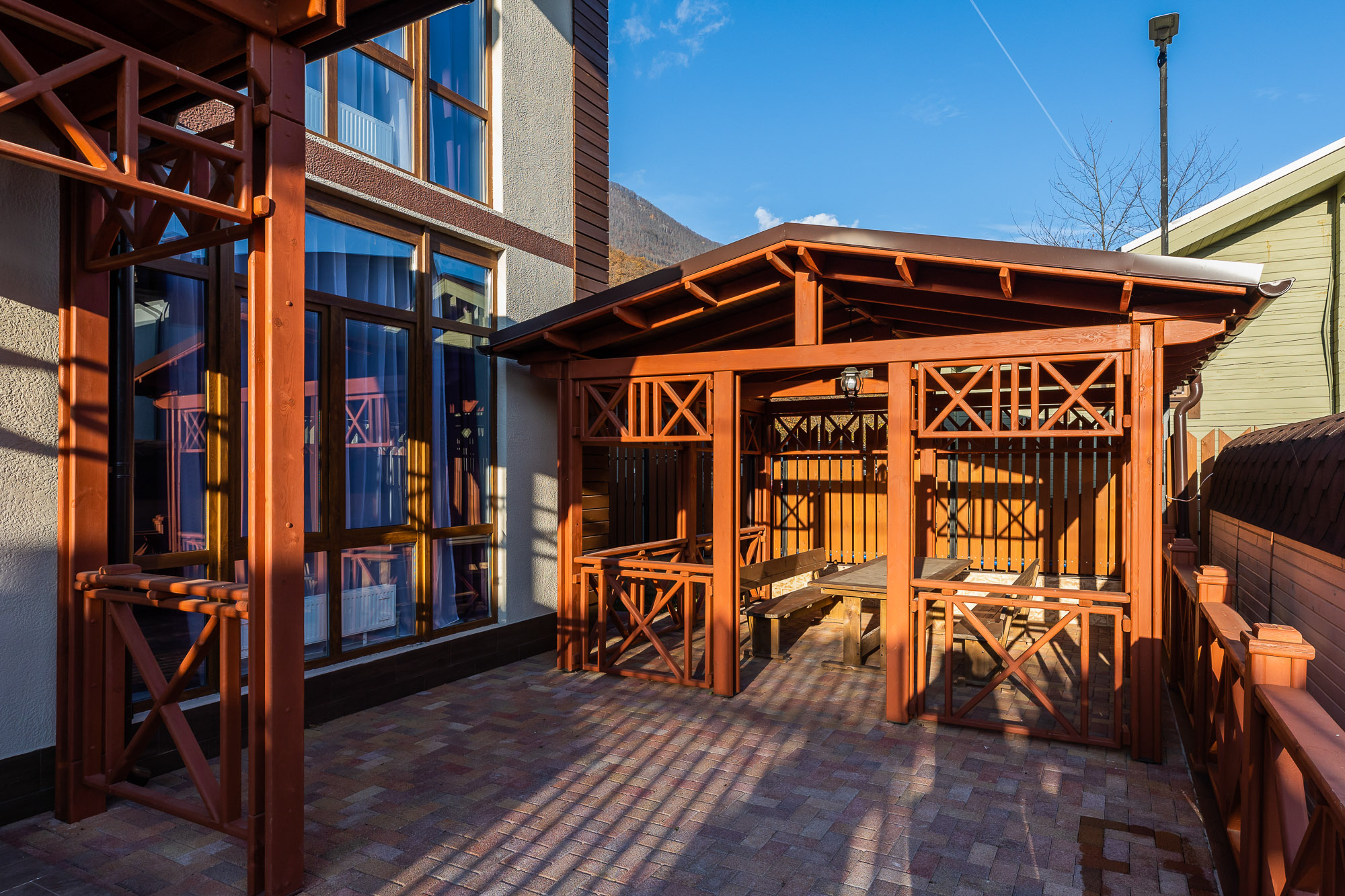 На закрытой благоустроенной территории располагаются трехэтажный корпус отеля и двухэтажная вилла для компаний, выстроенные с элементами фахверкового стиля. Жилой фонд включает в себя 24 современных комфортабельных номера. Каждый оснащен индивидуальной ванной комнатой с набором косметических принадлежностей для гостей, есть кондиционер и бытовая техника. В ряде номеров имеются панорамные окна и балконы, откуда открываются живописные виды на Кавказские горы.