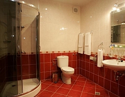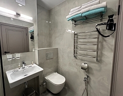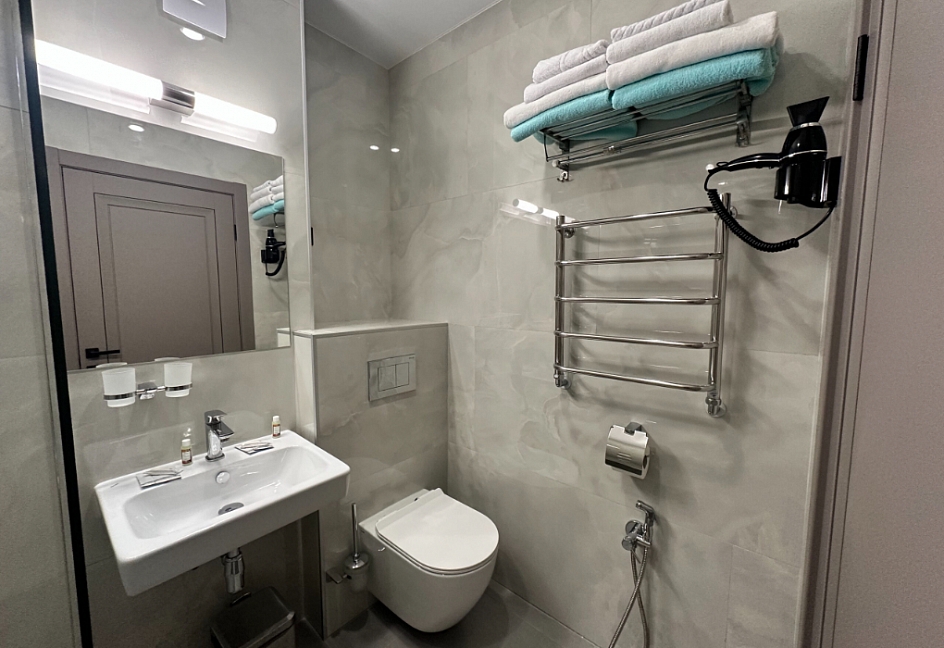 биде, с душевой кабиной, тапочки, туалетные принадлежности, фен, халат