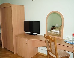 зеркало, кровати односпальные /одна двуспальная кровать, прикроватные тумбочки, стол, стул, шкаф