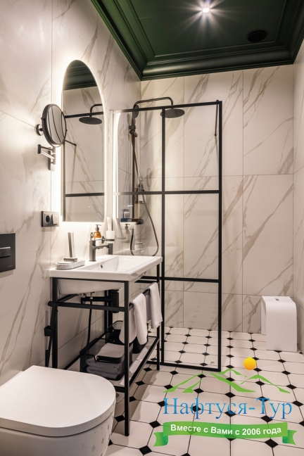с душевой кабиной, тапочки, туалетные принадлежности, фен, халат