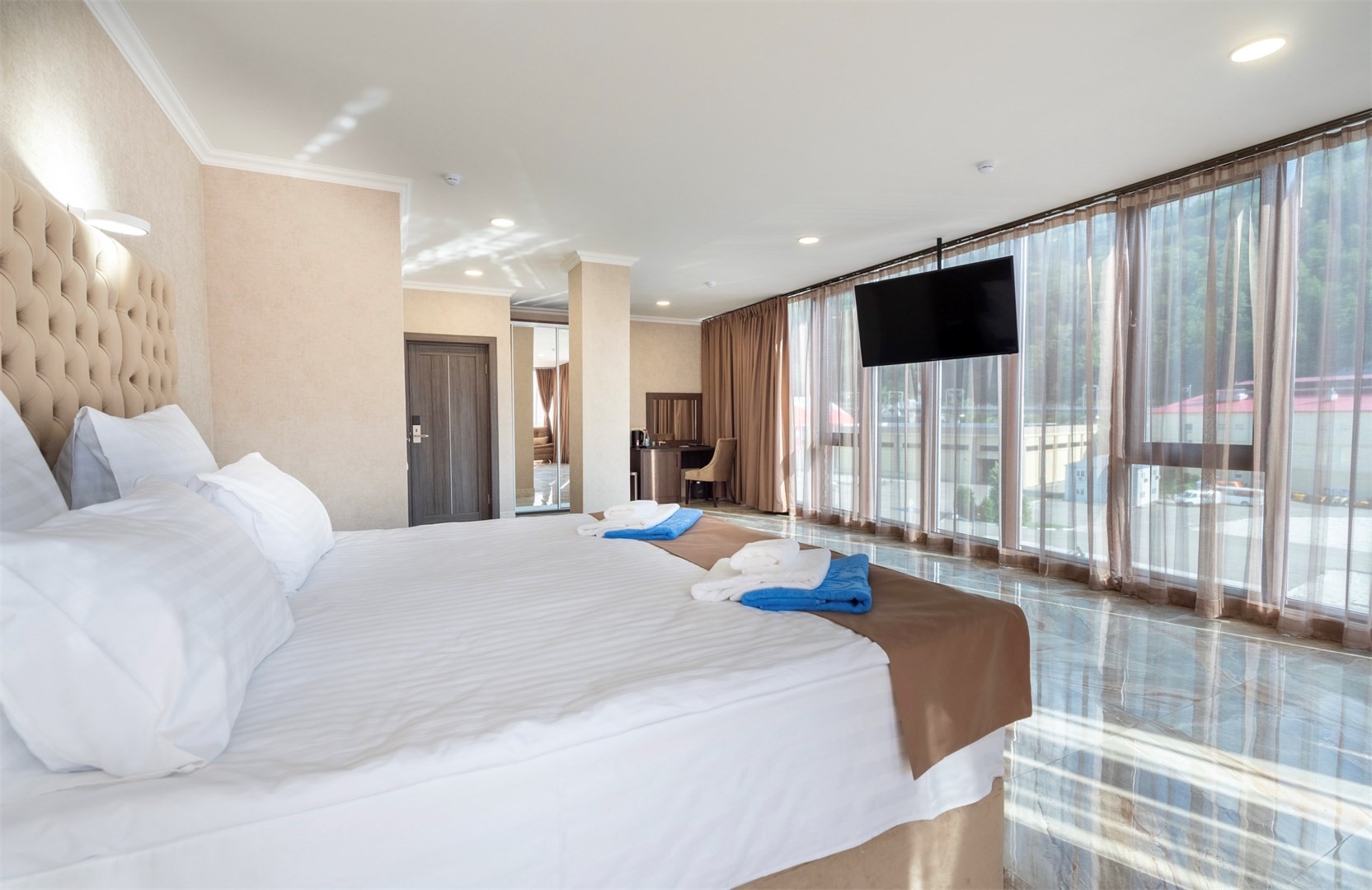 Поездом до ж/д станции Эсто-Садок, далее на автобусе №105, 105с, 535 в направлении: «Роза Хутор» до остановки Мегафон», далее пешком 154 м до отеля.