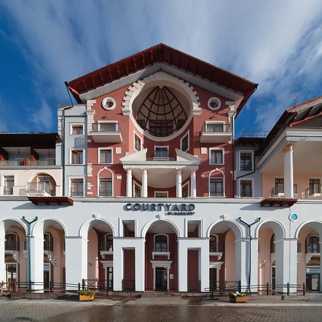 Отель «Кортъярд Марриотт» расположен на высоте 540 метров над уровнем моря в центре курорта Красная Поляна (поселок Эсто Садок). Гостиница имеет два корпуса с более чем 200 номерами нескольких категорий комфортности от «Стандарта» до апартаментов класса люкс. Каждый номер оснащен французскими окнами и террасами (балконами). Расстояние от отеля «Кортъярд Марриотт» до ближайшей станции канатной дороги составляет всего 50 метров. Гостиница во всем отвечает стандартам международной сети отелей Marriott, в каждом корпусе работает ресторан с детским меню, возможно поселение гостей с домашними животными в том числе крупных размеров. В стоимость тура в отель «Кортъярд Марриотт» включены завтраки по системе «шведского стола», работает room service. Инфраструктура гостиницы включает в себя тренажёрный зал, сауну, круглогодично работающий пункт проката спортивного инвентаря, комнаты хранения и сушки горнолыжного снаряжения, прачечную. Рядом с отелем «Кортъярд Марриотт» расположены общекурортные наземная и подземная автопарковка, центральная аллея курорта, залы игровых автоматов и элитное казино, концертные площадки, торгово-развлекательный центр.