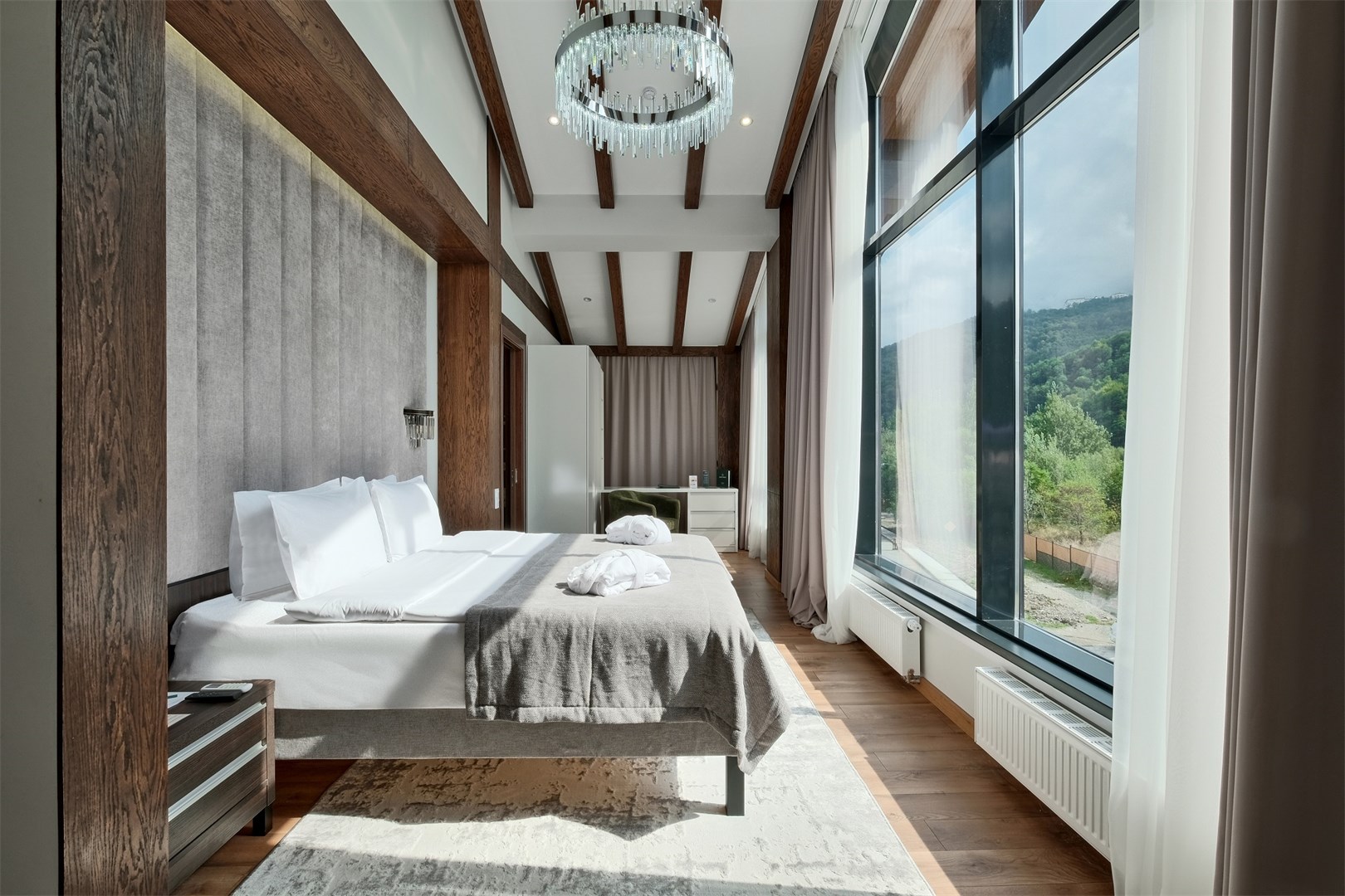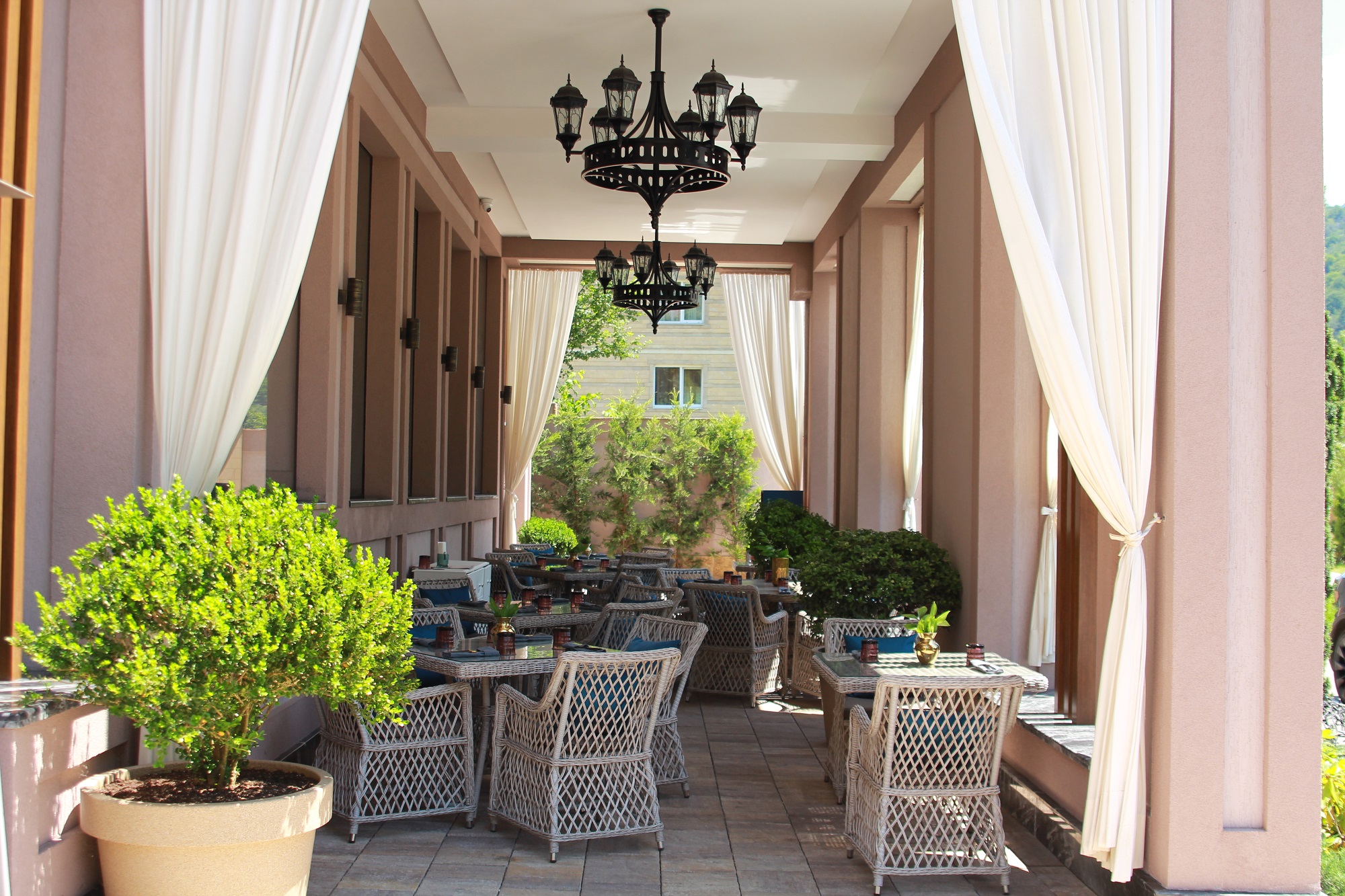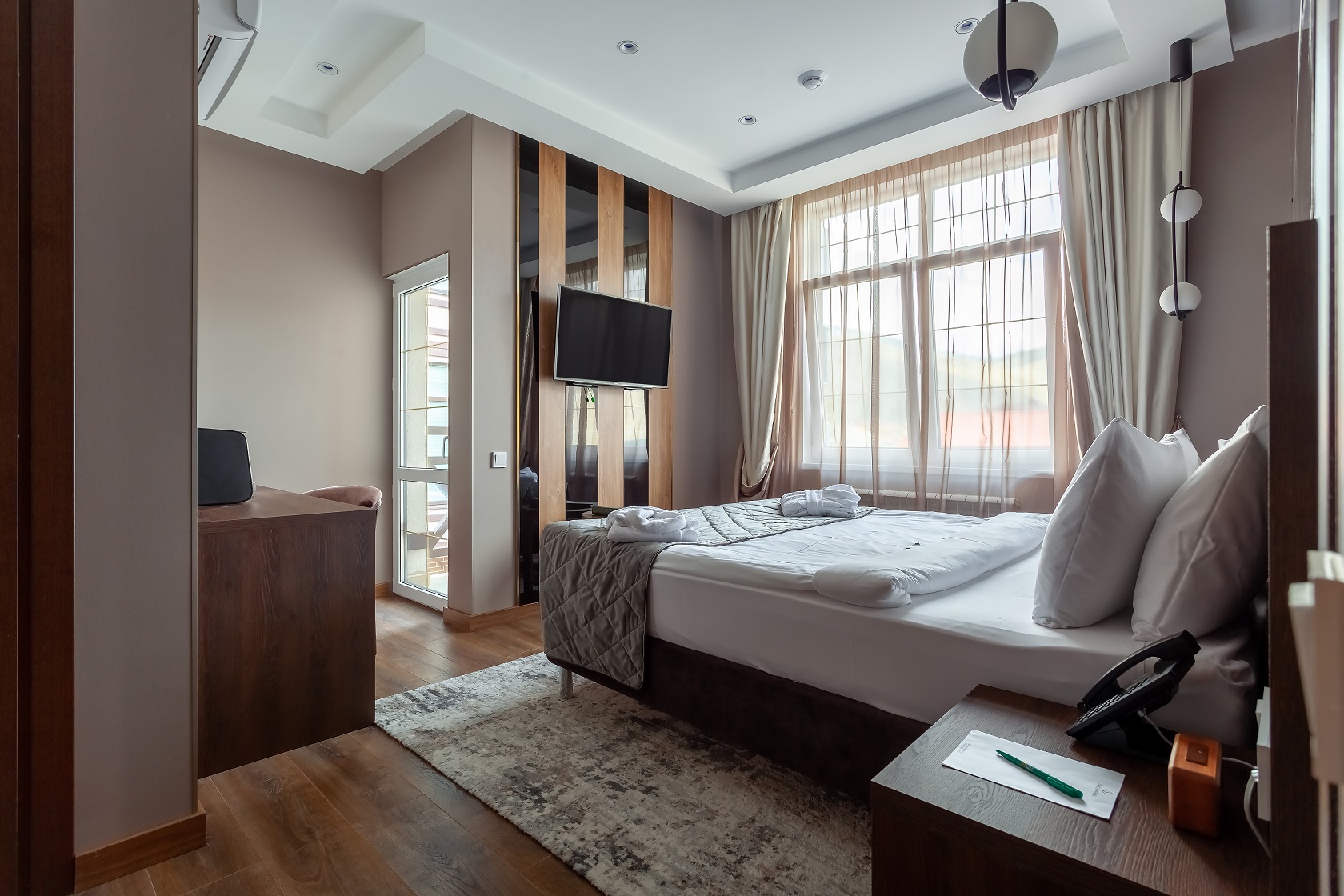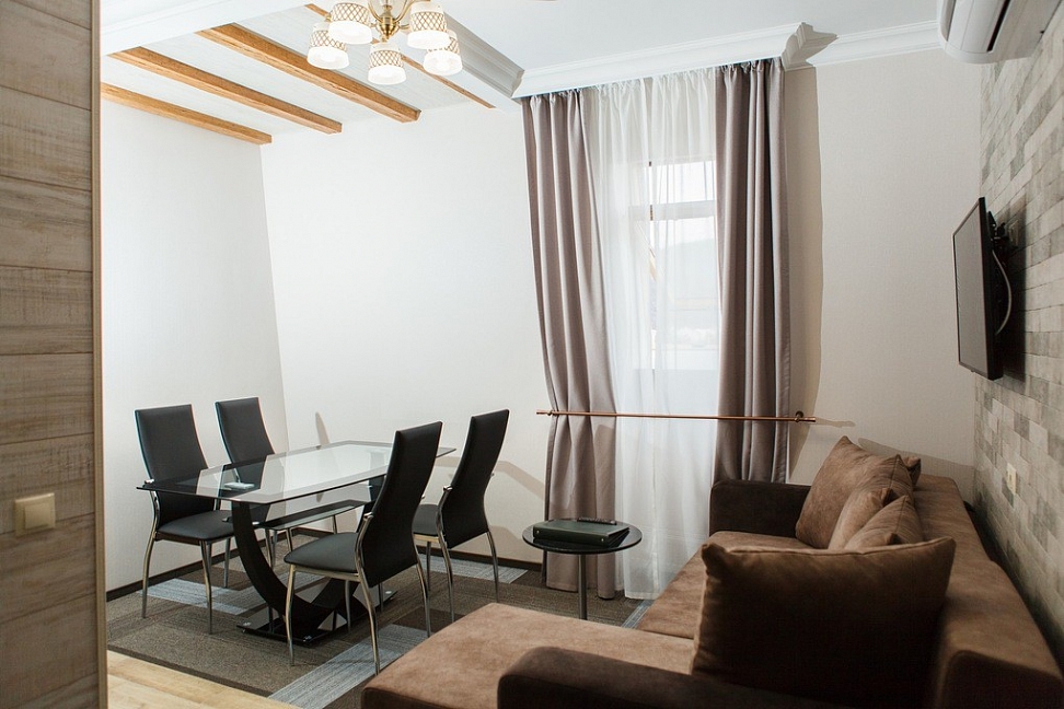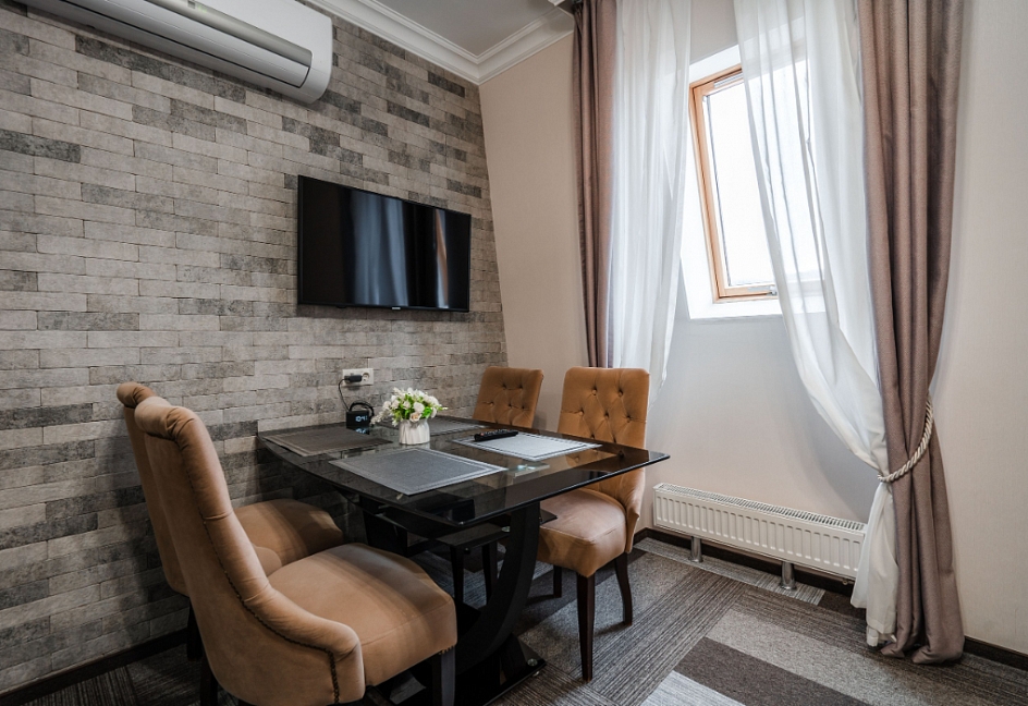 Собственно шикарный номер в шикарном отеле.Отель расположен в отдалении от главной дороги,поэтому здесь тихо.Ухоженная территория с диванами и стульями,небольшая парковка.Даже если на ней не хватает места,можно припарковаться на тротуар за забором.