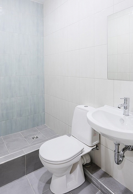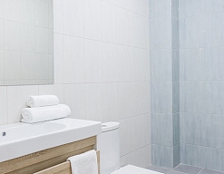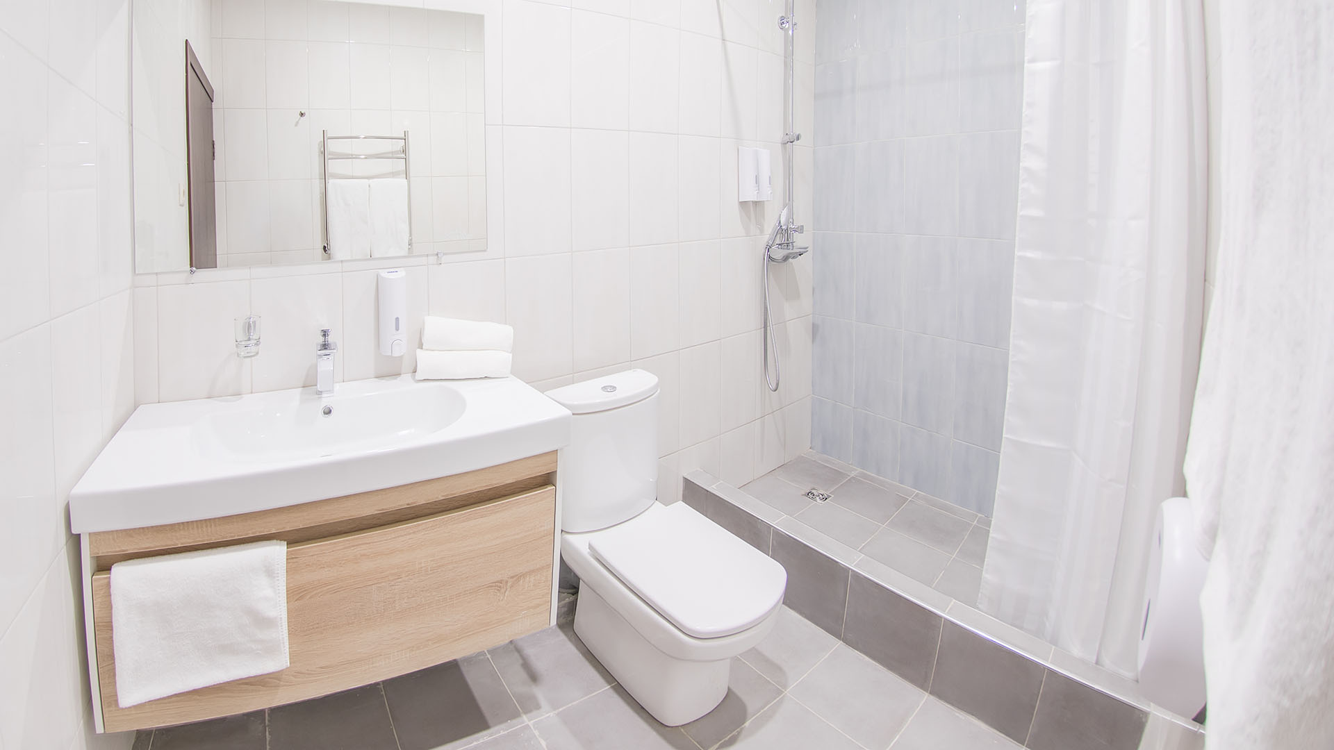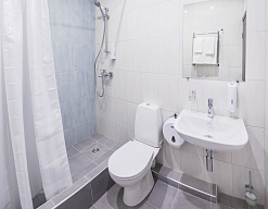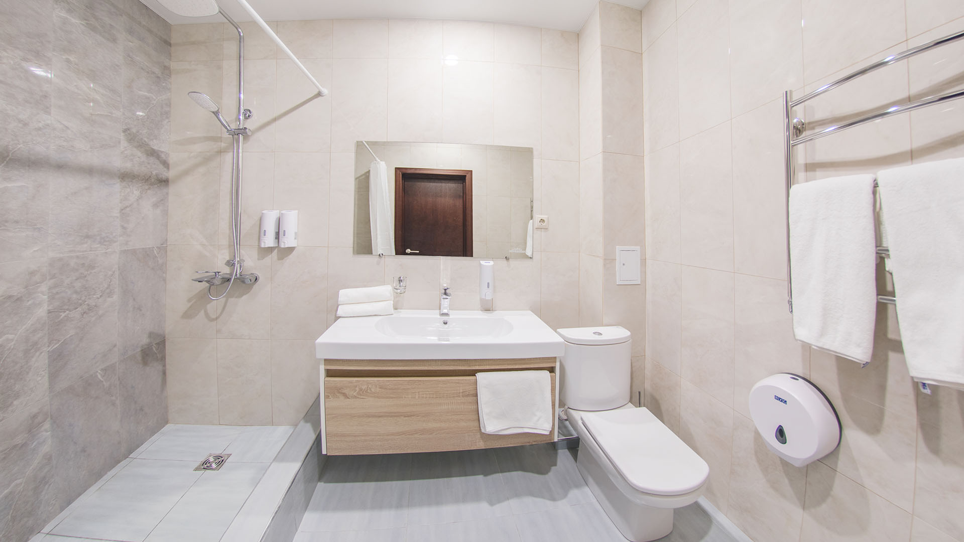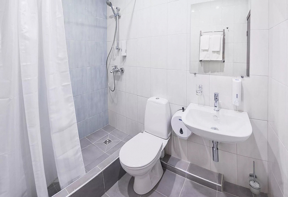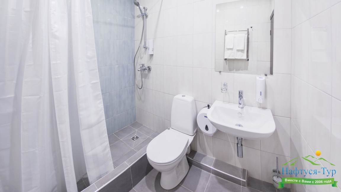с душем, тапочки, туалетные принадлежности, фен, халат
