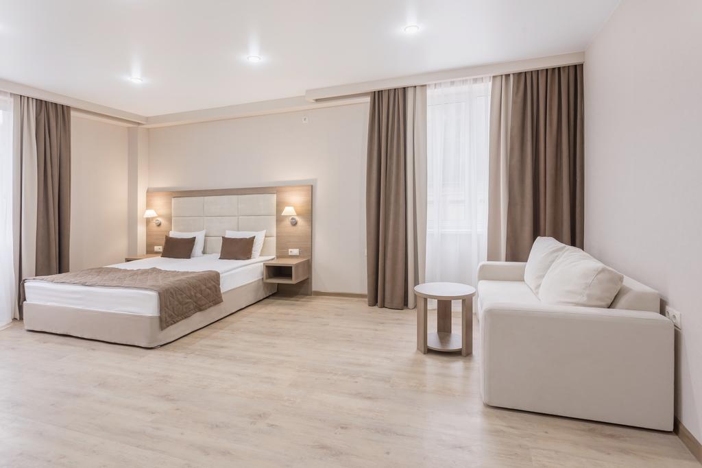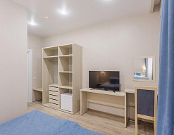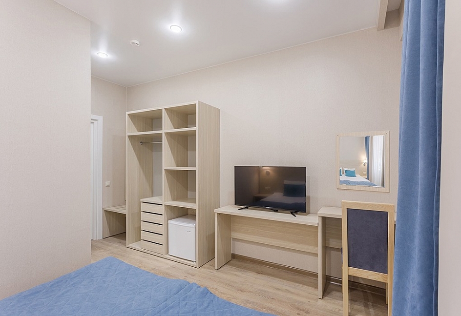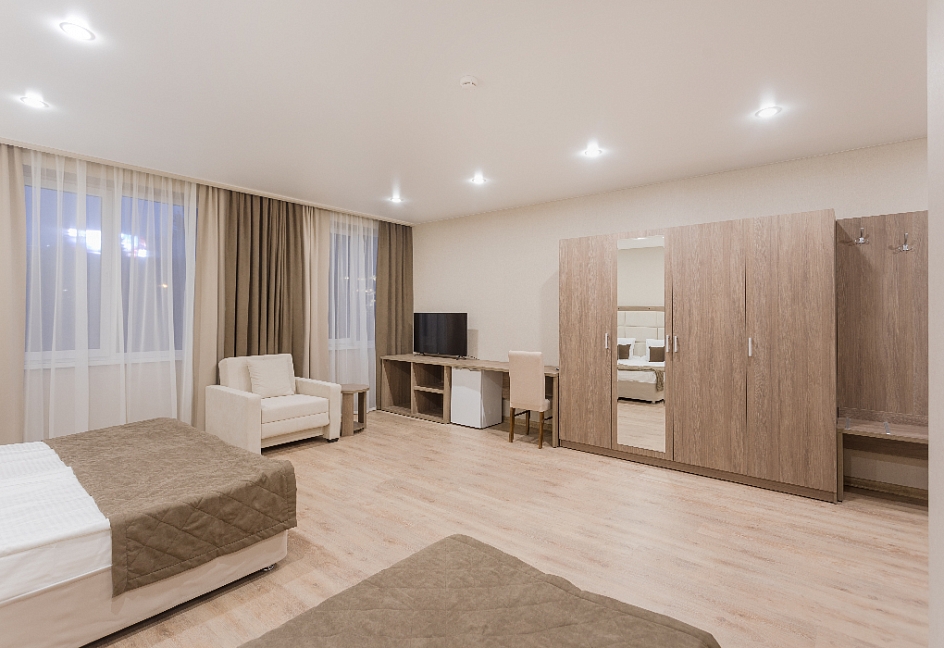 зеркало, кровати односпальные /одна двуспальная кровать, прикроватные тумбочки, стол, стул, шкаф