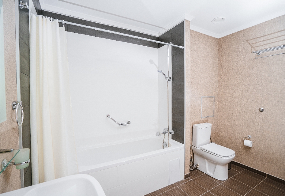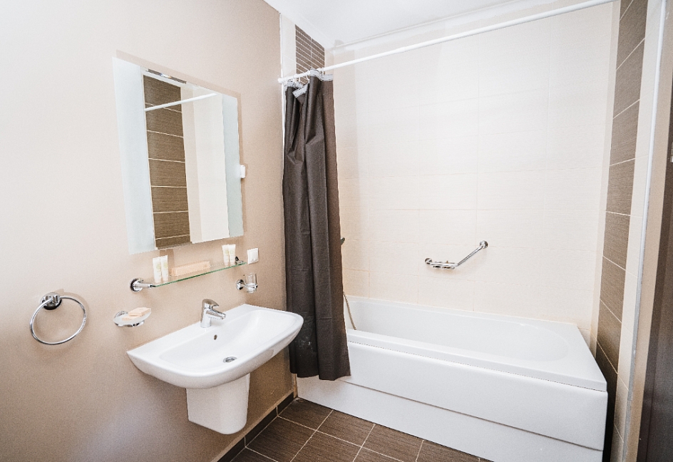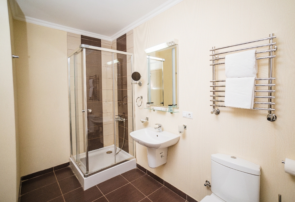 с душем, тапочки, туалетные принадлежности, фен, халат