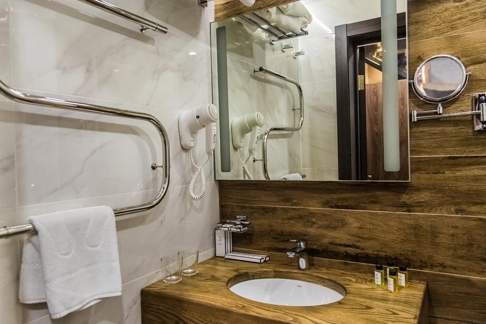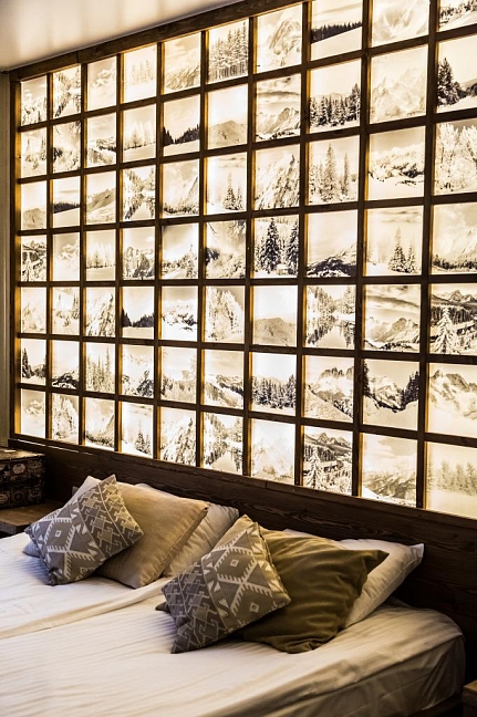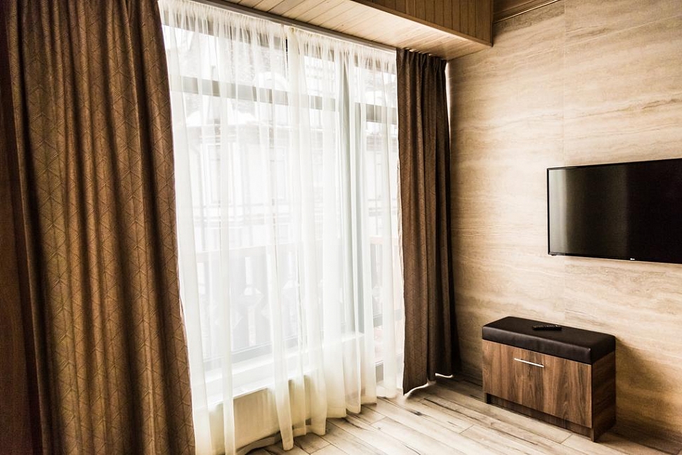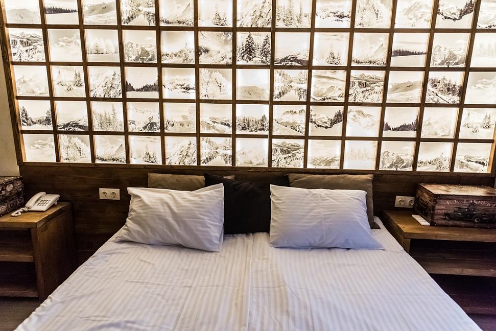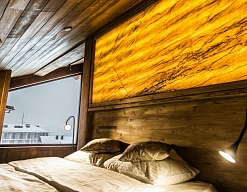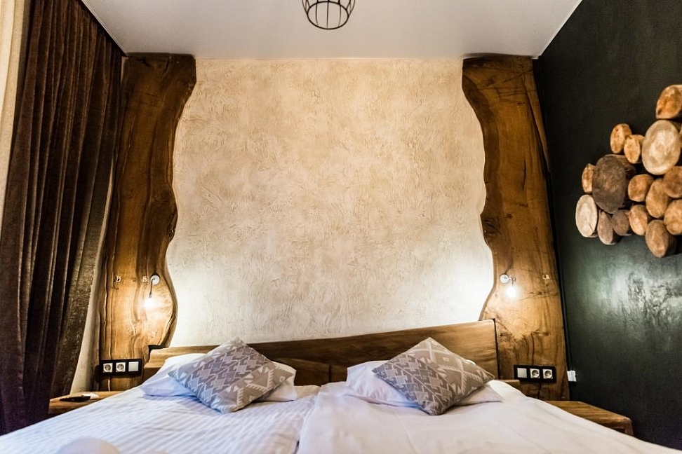 · Отличный номер ! Запах натурального дерева, чисто, отделка дикого камня, Лестницы и Шторы с подсветкой, перегородки из каленого стекла, даже перегородки лестниц, совместили шале и современный стиль.