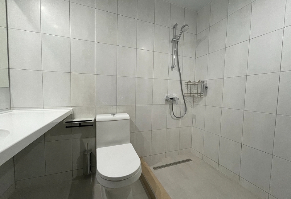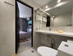 с душем, тапочки, туалетные принадлежности, фен, халат