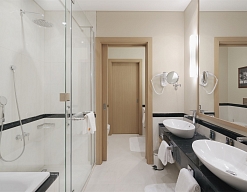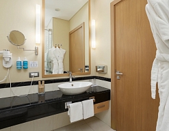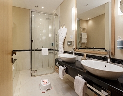 с ванной, с душевой кабиной, тапочки, туалетные принадлежности, фен, халат