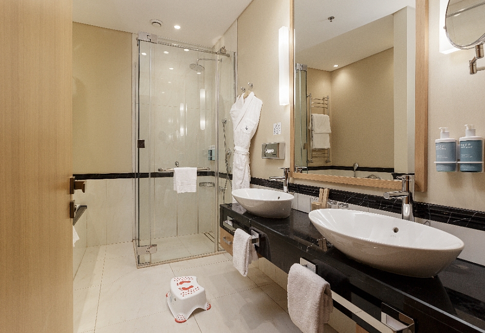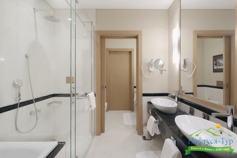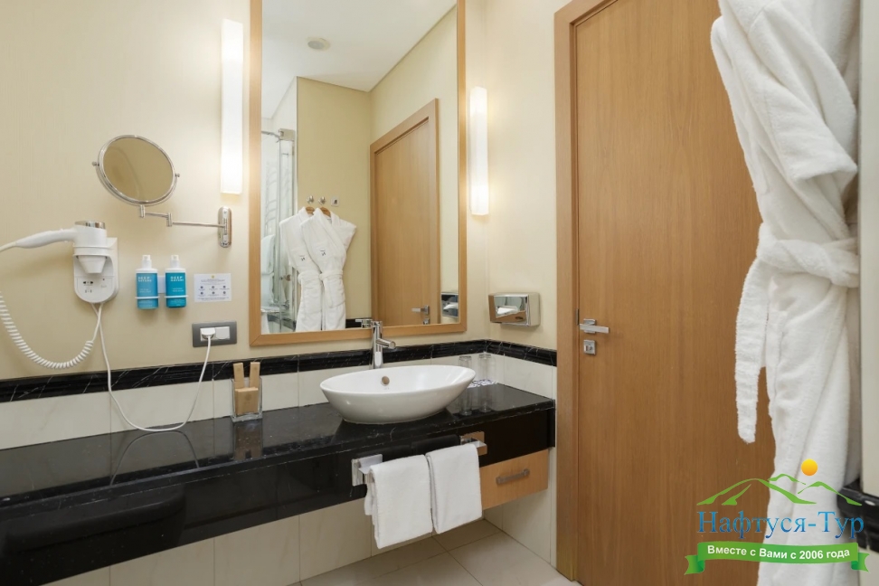 с душем, тапочки, туалетные принадлежности, фен, халат