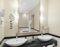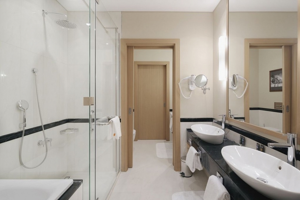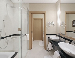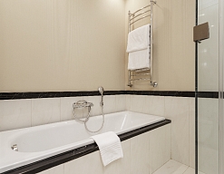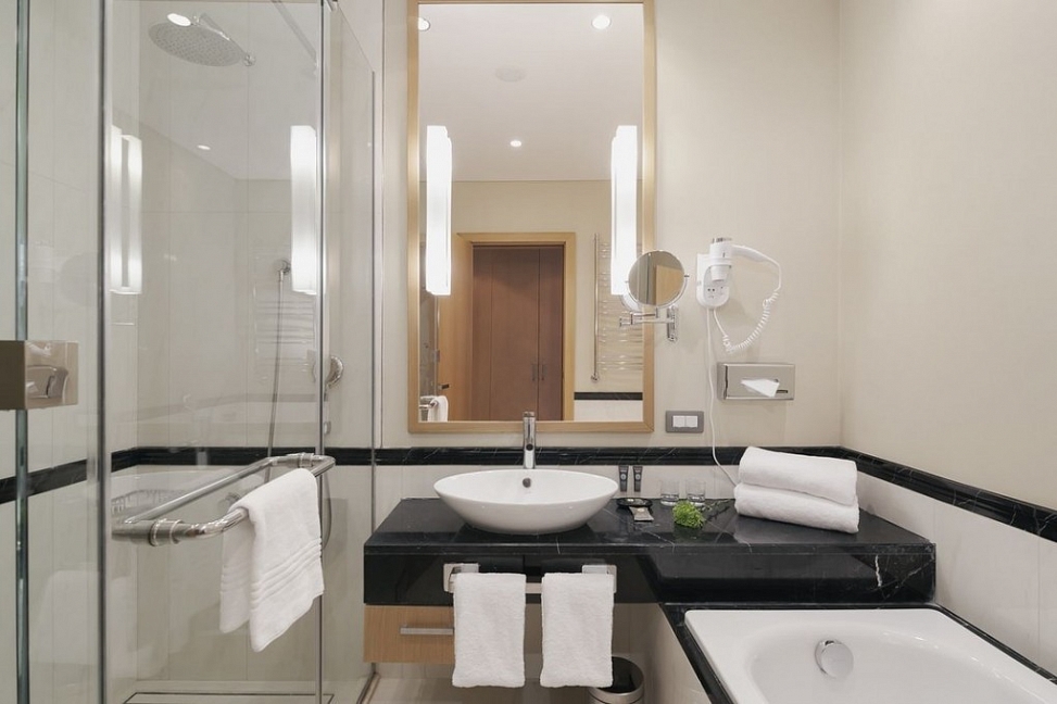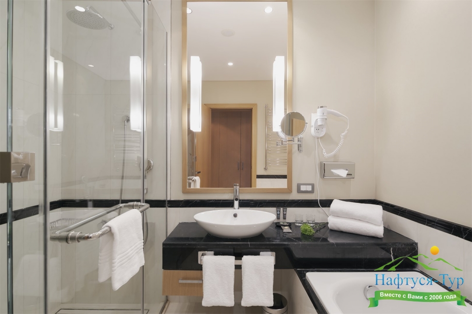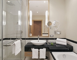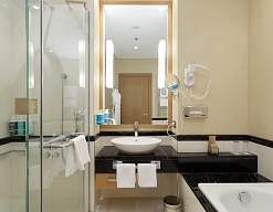 с ванной или душевой кабиной, туалетные принадлежности, фен