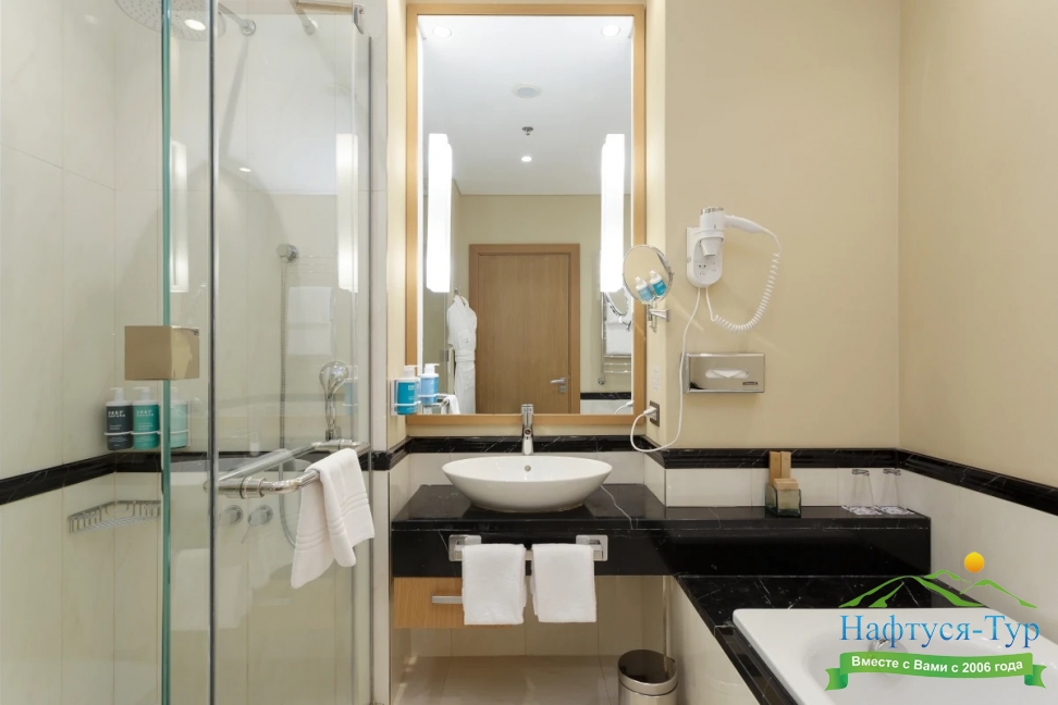с ванной и душевой кабиной, тапочки, туалетные принадлежности, фен, халат