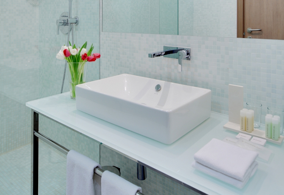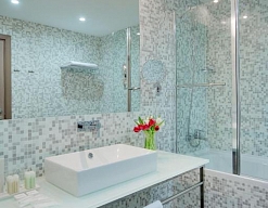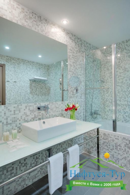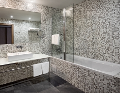 с ванной, тапочки, туалетные принадлежности, фен, халат