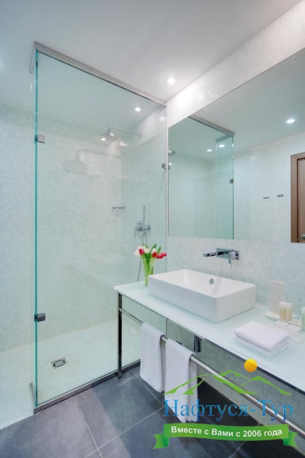 с душевой кабиной, тапочки, туалетные принадлежности, фен, халат