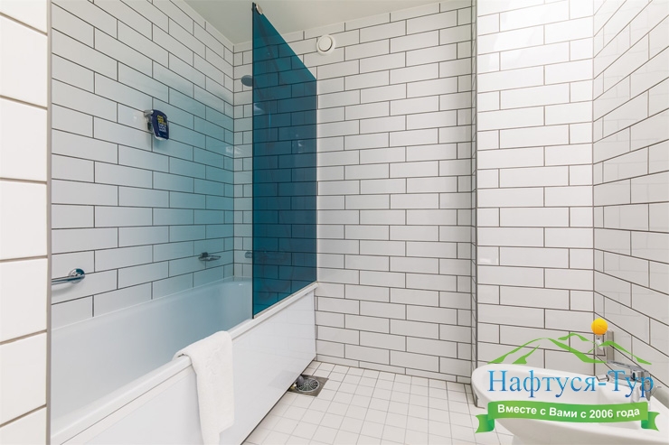 с ванной, тапочки, туалетные принадлежности, фен, халат