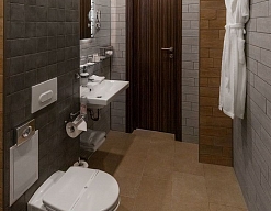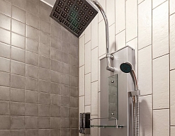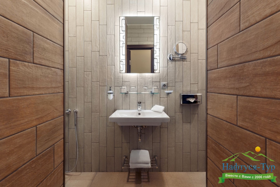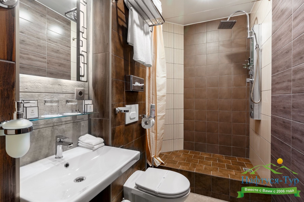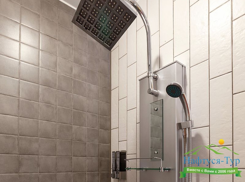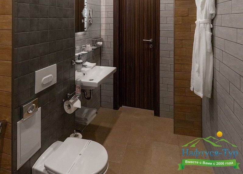 с душем, тапочки, туалетные принадлежности, фен, халат