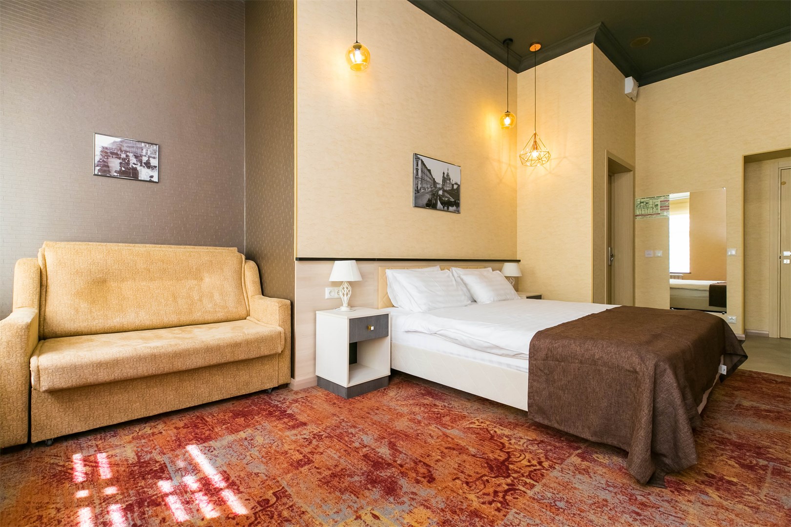 вешалка, зеркало, кровати односпальные /одна двуспальная кровать, прикроватные тумбочки, стол, стулья