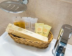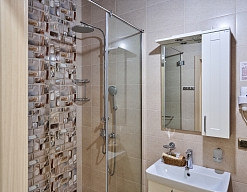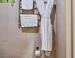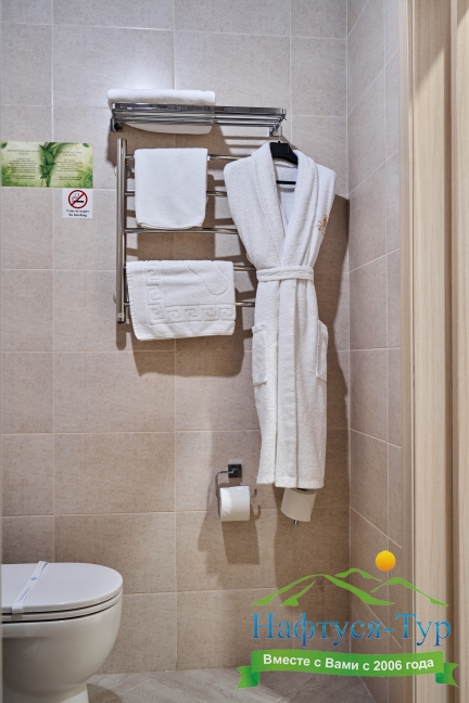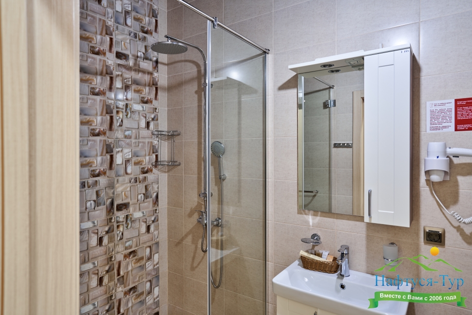 с душевой кабиной, тапочки, туалетные принадлежности, фен, халат