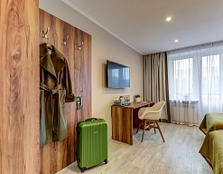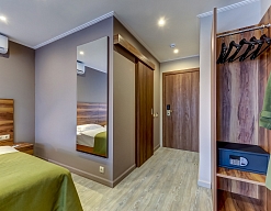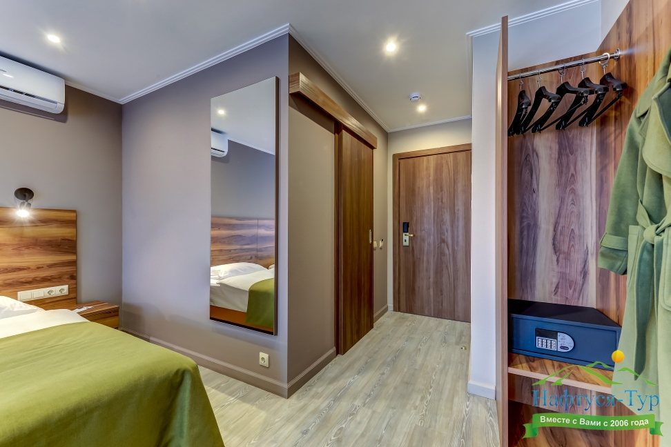 вешалка, зеркало, кровати односпальные /одна двуспальная кровать, прикроватные тумбочки, стол, стул, шкаф