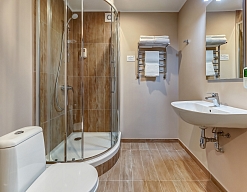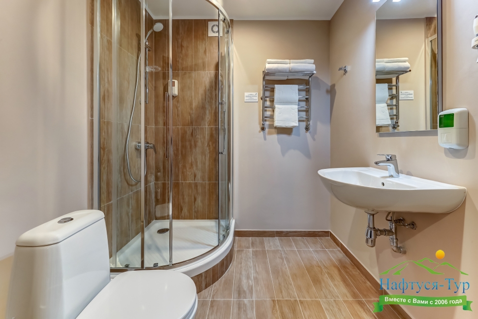 с душевой кабиной, тапочки, туалетные принадлежности, фен