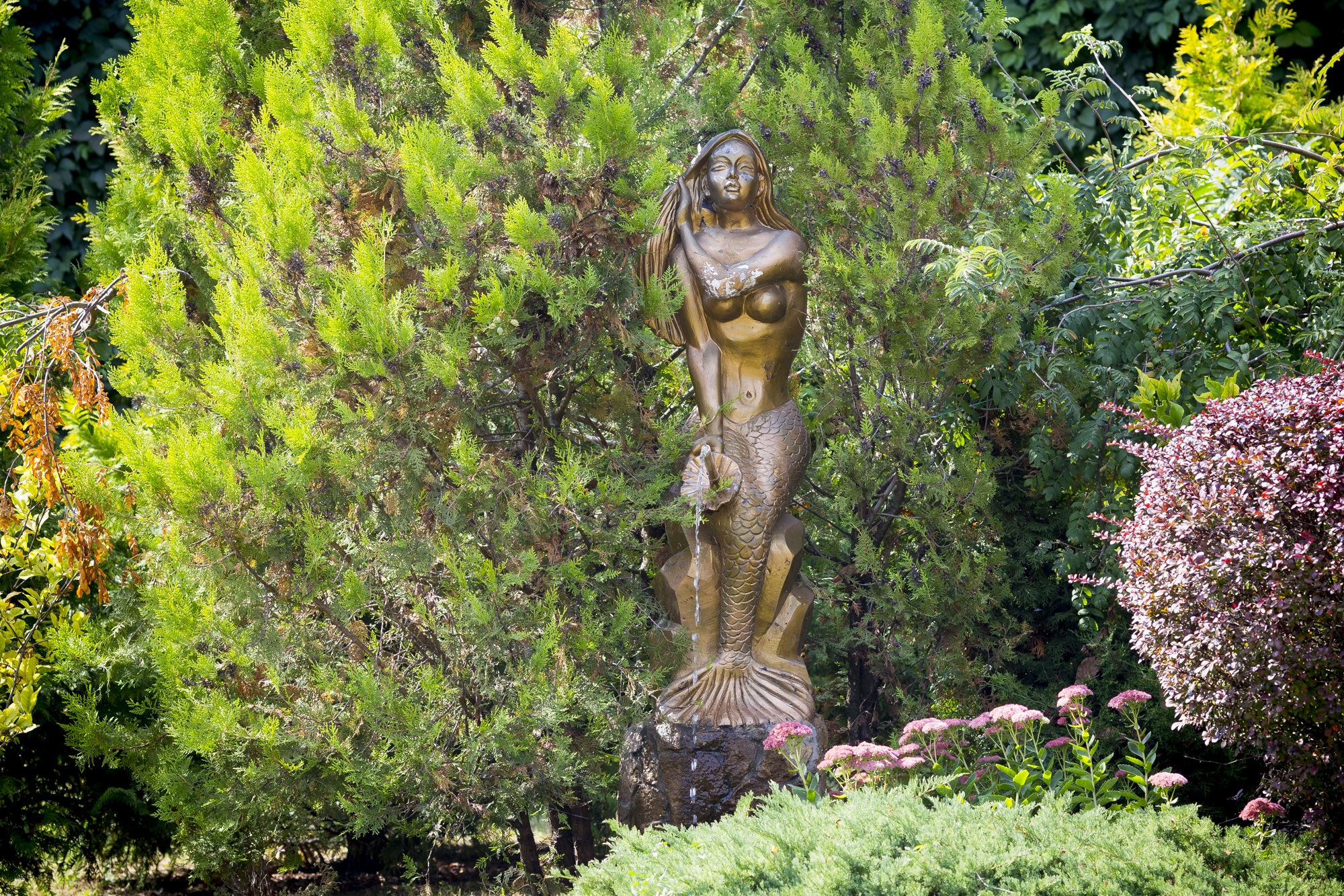Обширная территория здравницы, хорошо благоустроена, здесь большое количество зелени, деревьев разных пород, цветников.