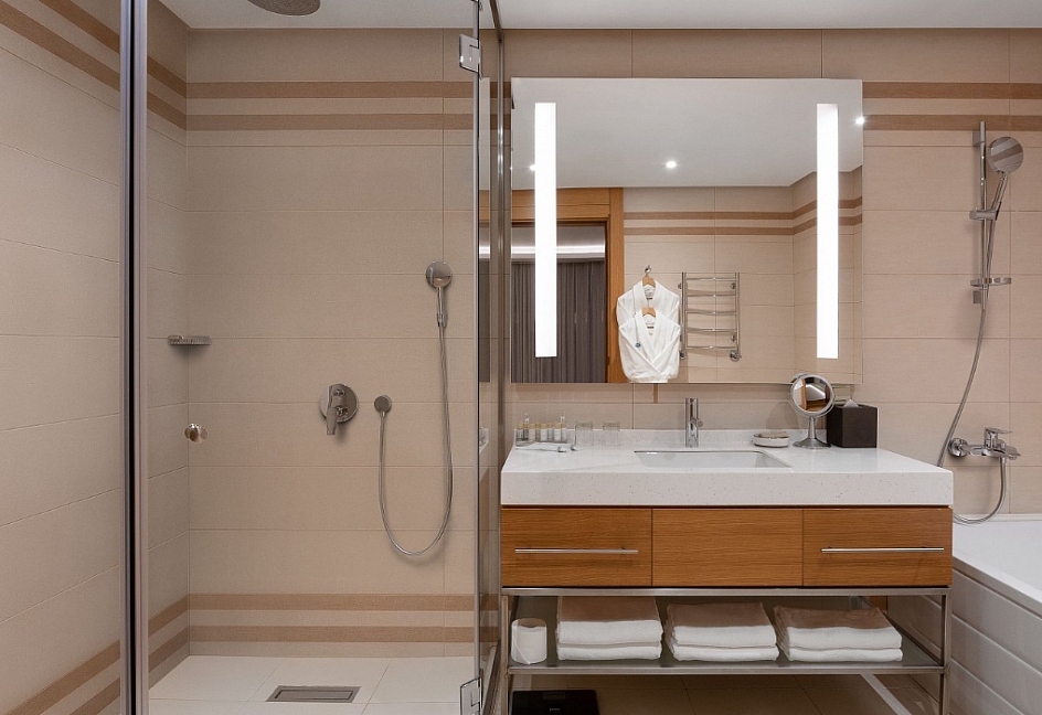 2 санузла, с душевой кабиной, тапочки, туалетные принадлежности, фен, халат