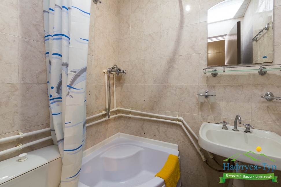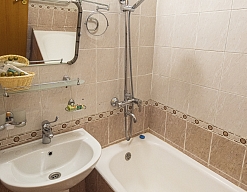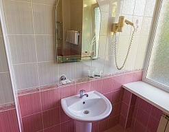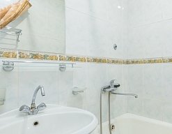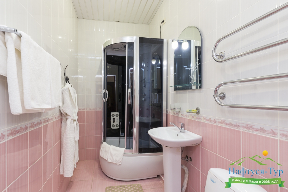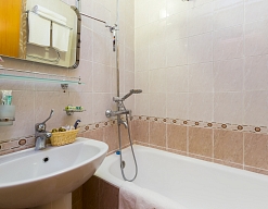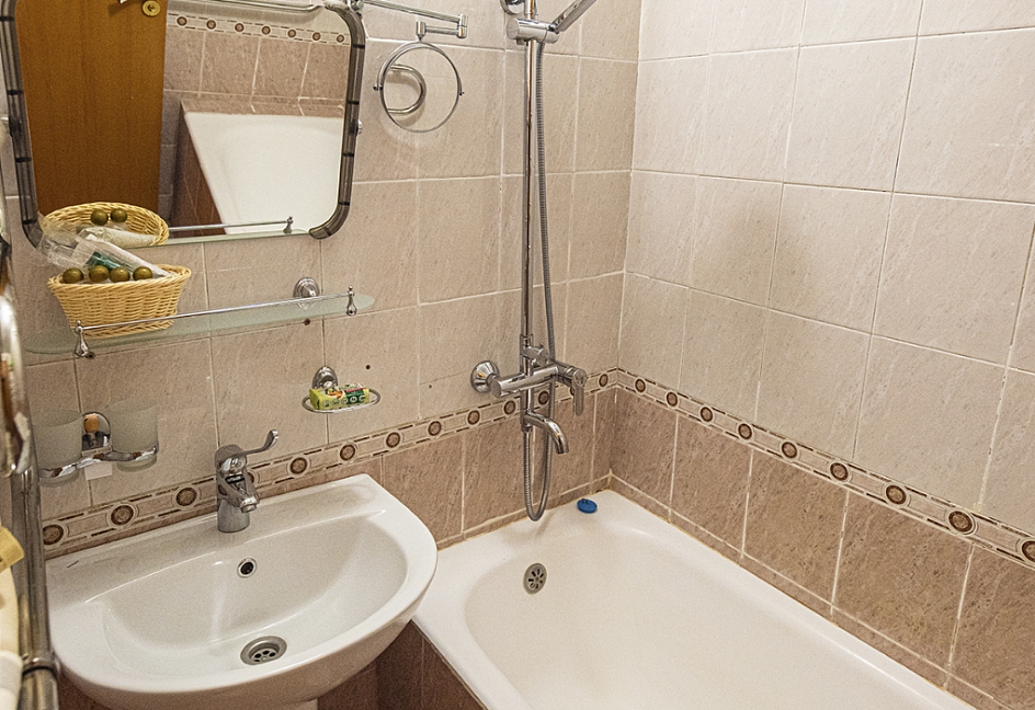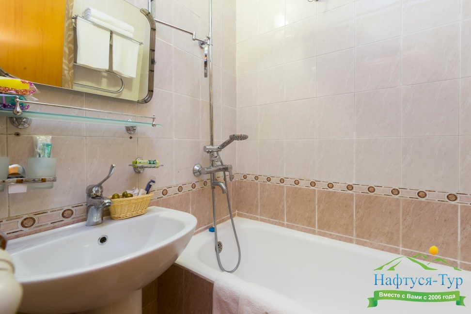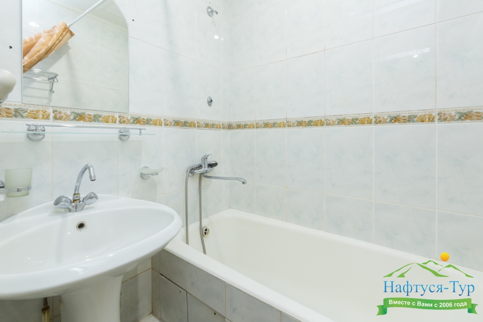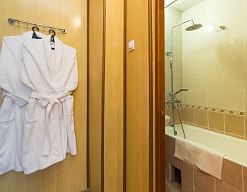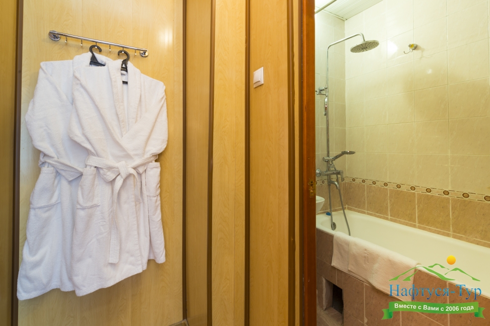 с ванной, тапочки, туалетные принадлежности, фен, халат