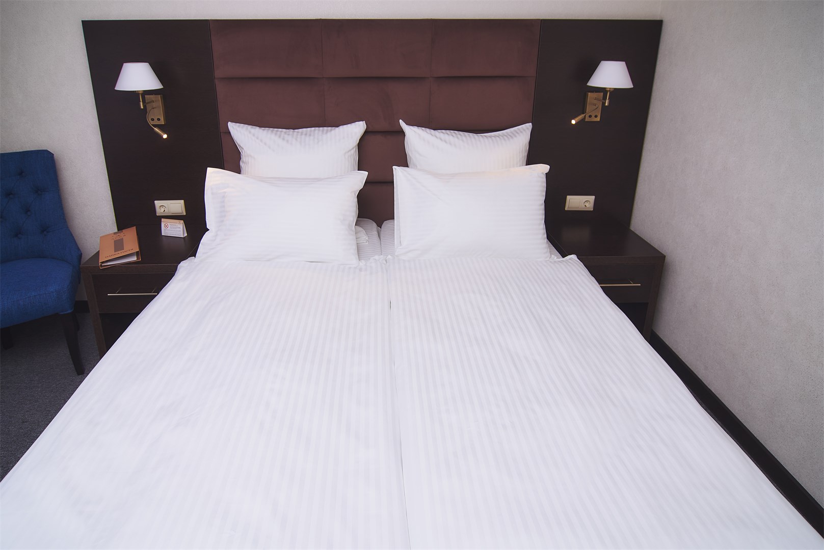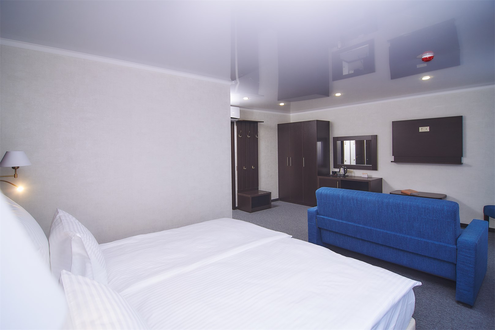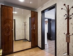 вешалка, зеркало, кровати односпальные /одна двуспальная кровать, прикроватные тумбочки, стол, стул, шкаф