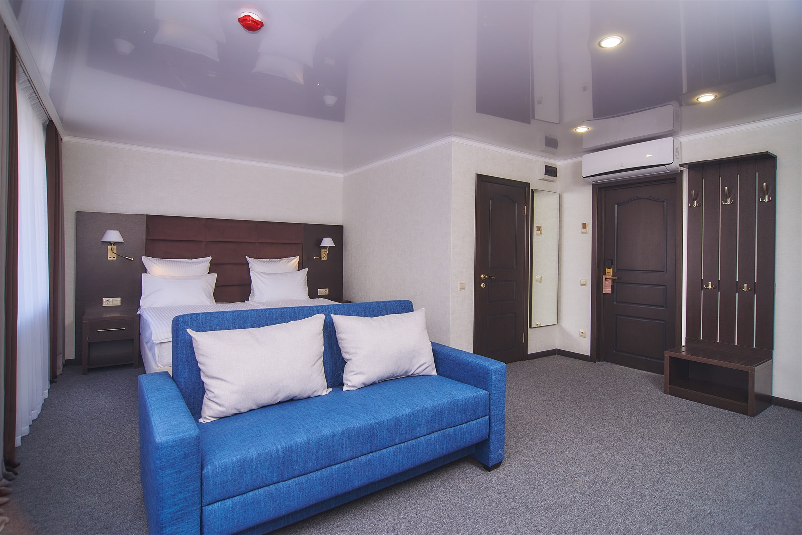 вешалка, диван, зеркало, кровать двуспальная, прикроватные тумбочки, стол, стул, шкаф