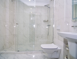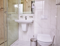 с душевой кабиной, туалетные принадлежности, фен