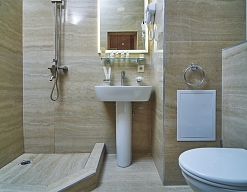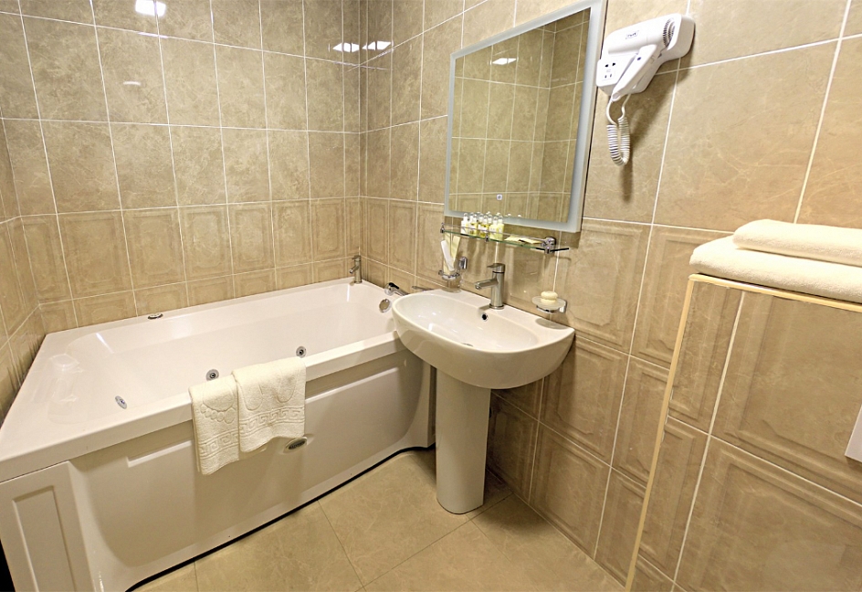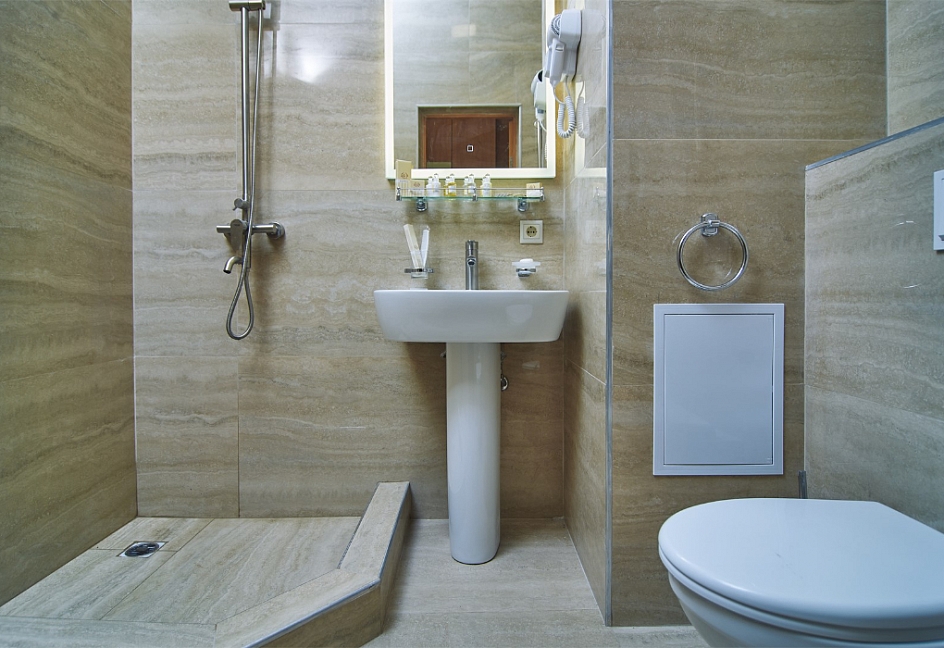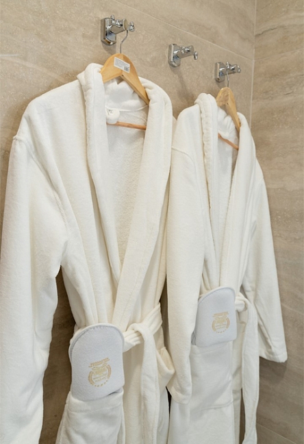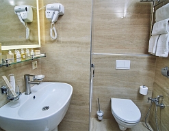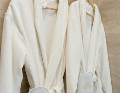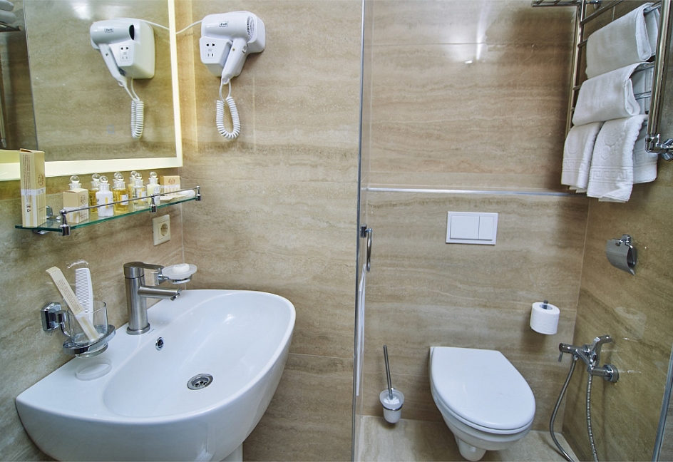 с душем, тапочки, туалетные принадлежности, фен, халат
