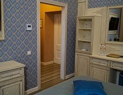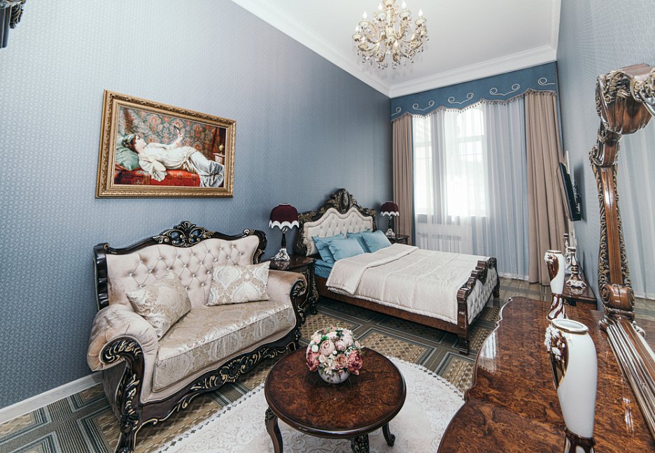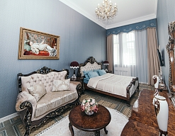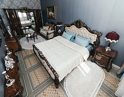 гардеробная, диван, зеркало, кресло, кровать двуспальная, прикроватные тумбочки, стол, стулья, тумба, шкаф
