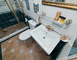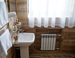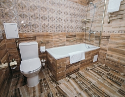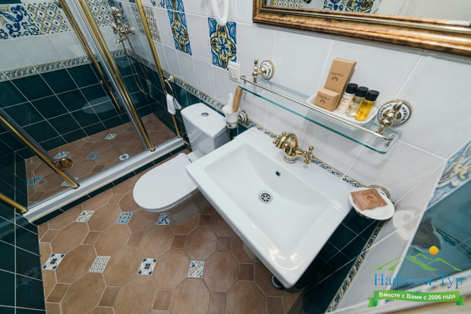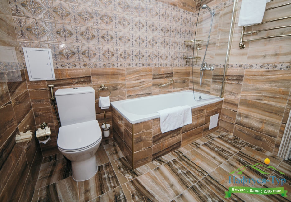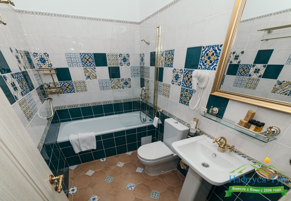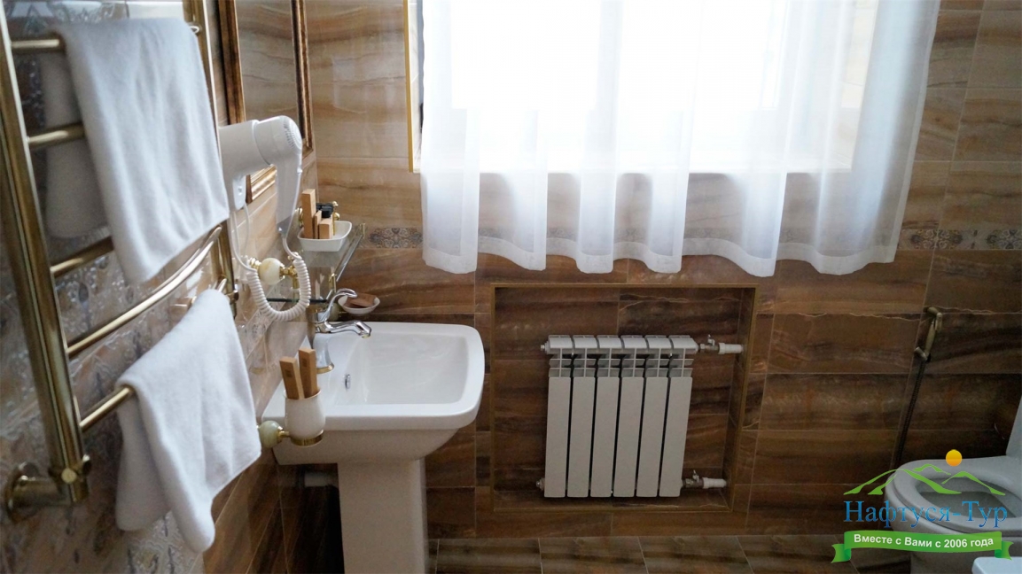 с душем или ванной, тапочки, туалетные принадлежности, фен, халат