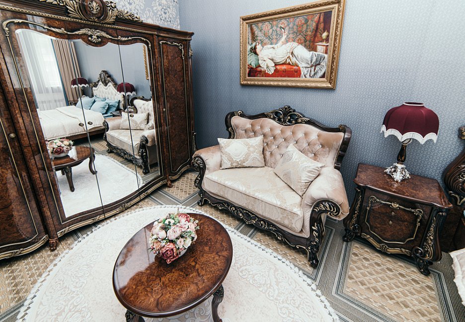 диван, зеркало, кровать двуспальная, прикроватные тумбочки, столик журнальный, стулья, шкаф