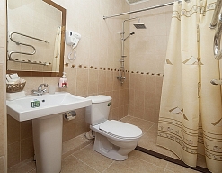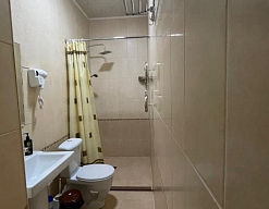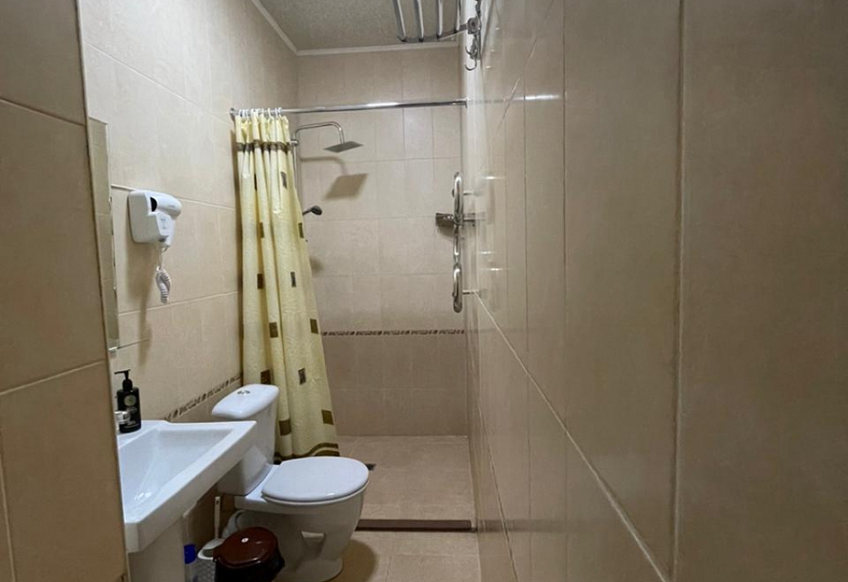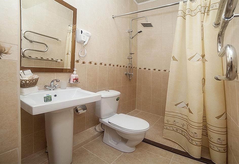 с душем, тапочки, туалетные принадлежности, фен, халат