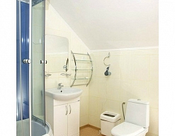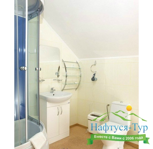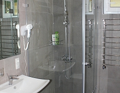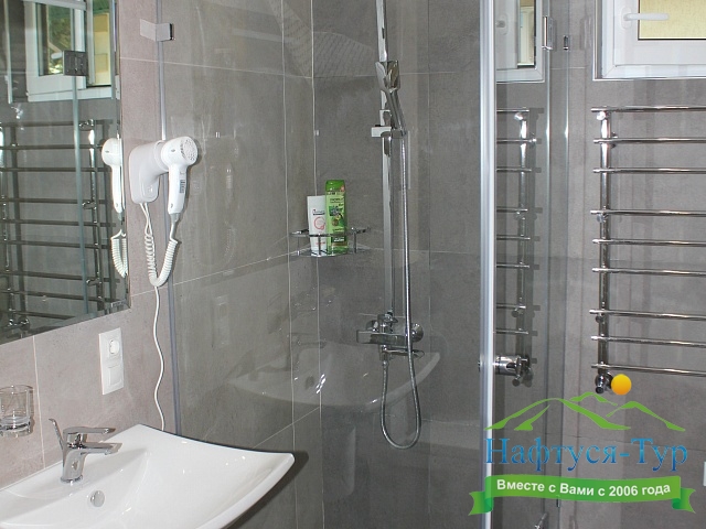 с душевой кабиной, тапочки, туалетные принадлежности, фен, халат