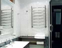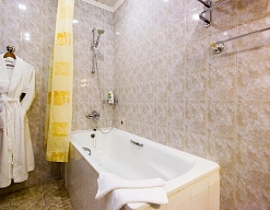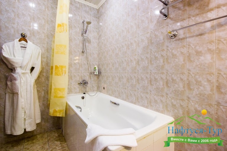 с ванной, тапочки, туалетные принадлежности, фен, халат