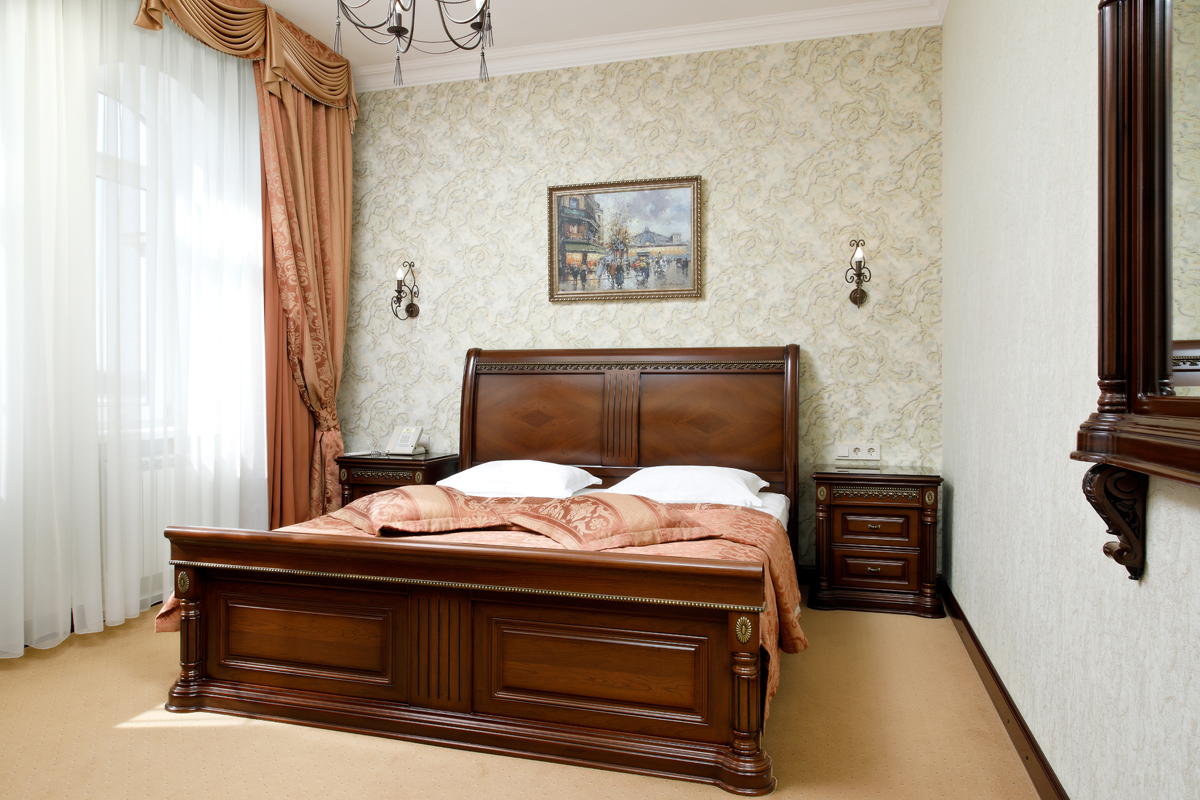 вешалка, зеркало, кровать двуспальная, прикроватные тумбочки, стол, стулья, шкаф