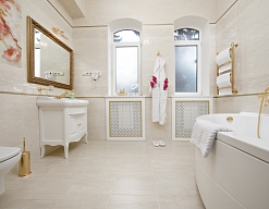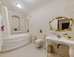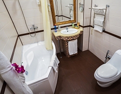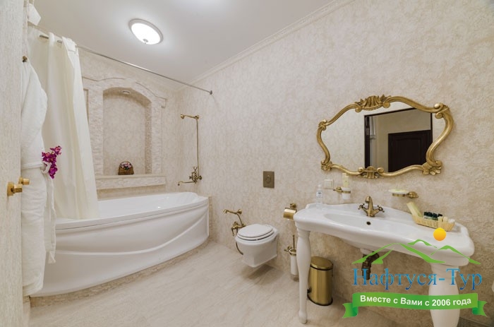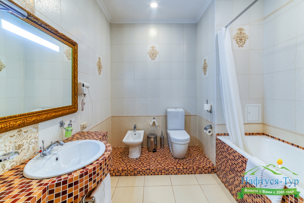 с ванной, тапочки, туалетные принадлежности, фен, халат