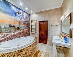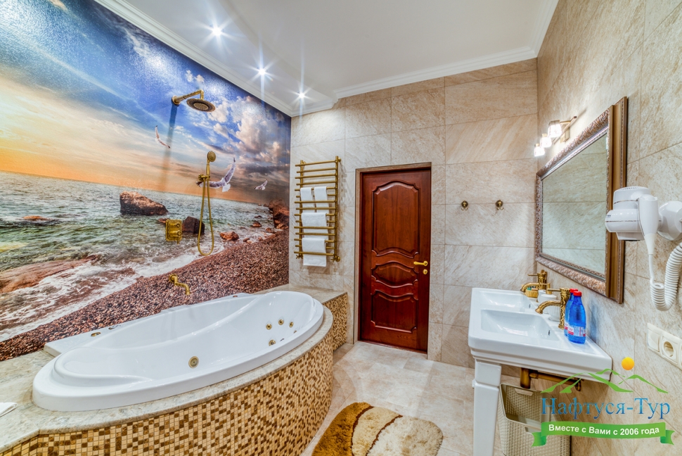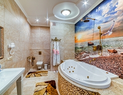 с джакузи, тапочки, туалетные принадлежности, фен, халат
