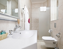 с ванной или душевой кабиной, тапочки, туалетные принадлежности, фен, халат