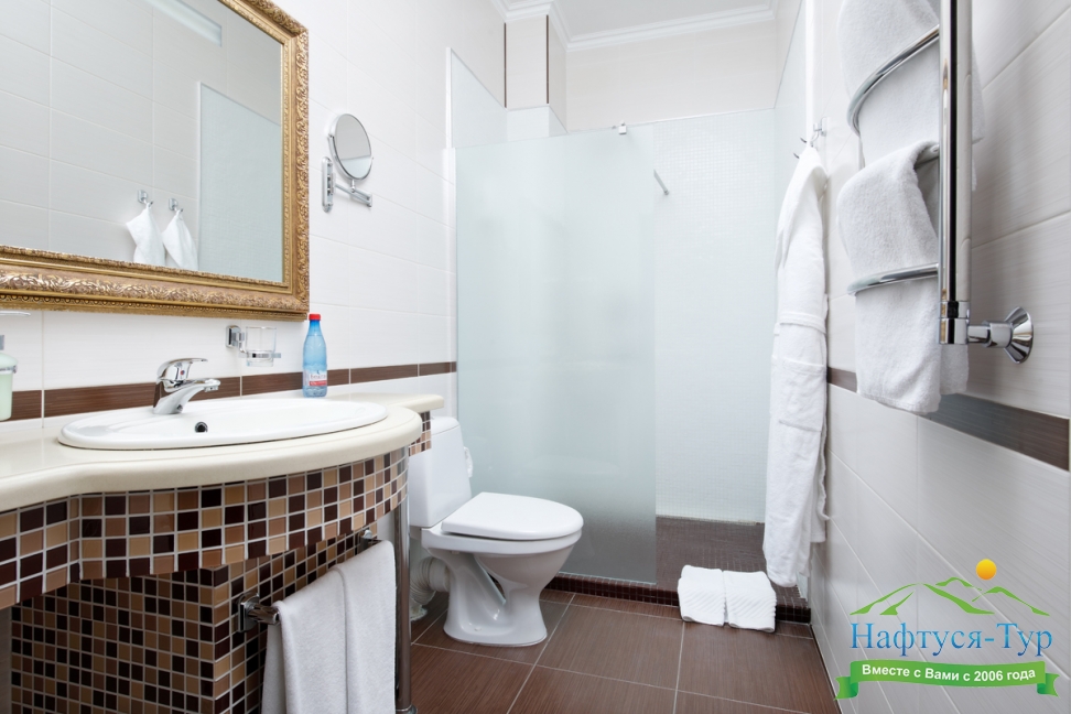 с душем, туалетные принадлежности, фен, халат