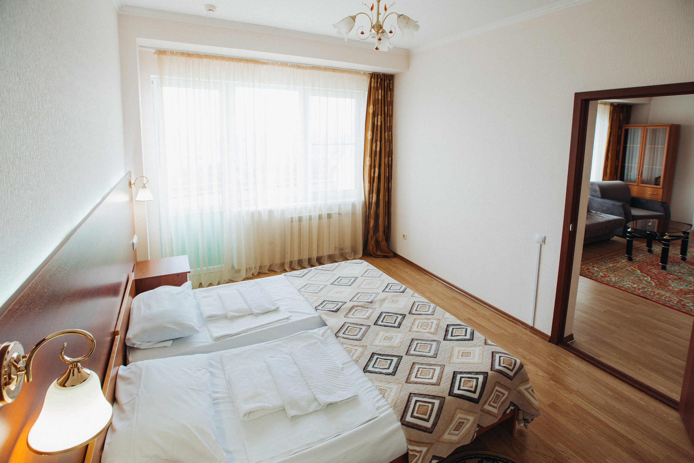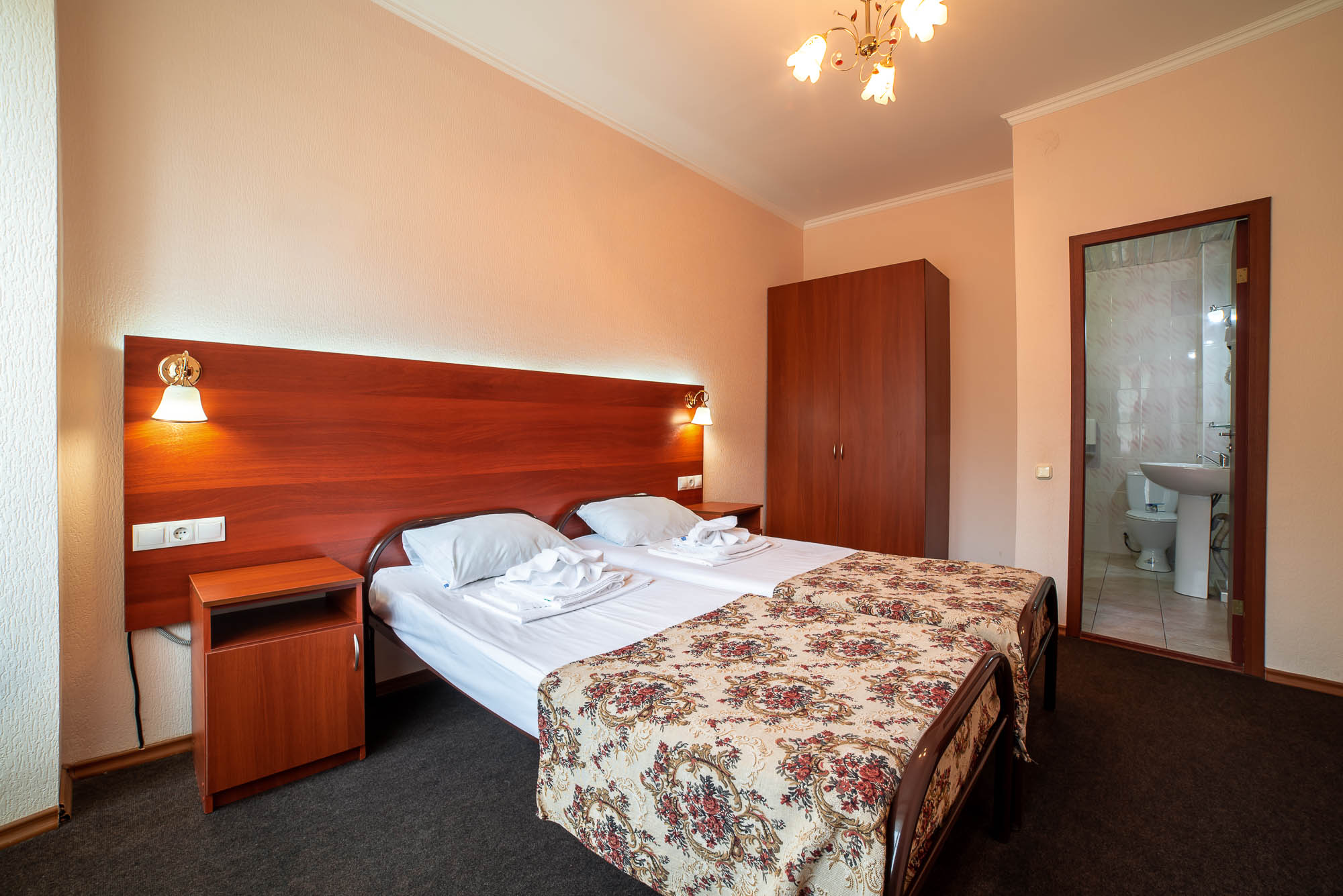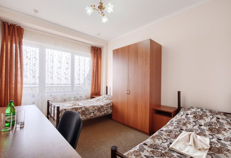 кровати односпальные /одна двуспальная кровать, прикроватные тумбочки, стол, стул, шкаф