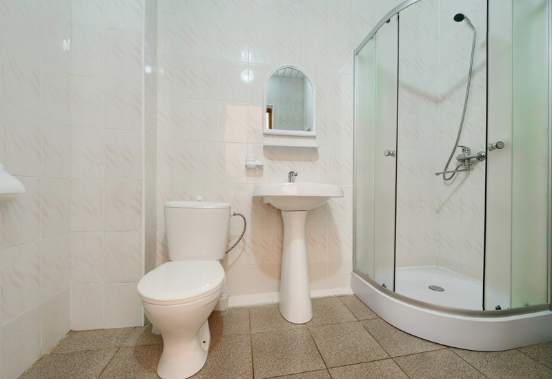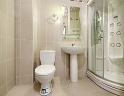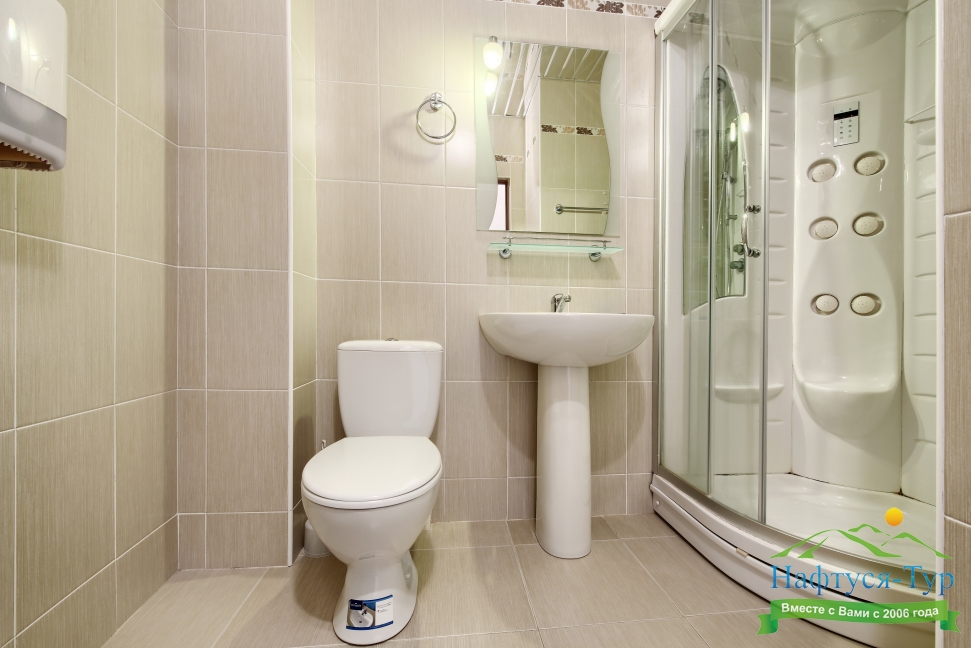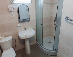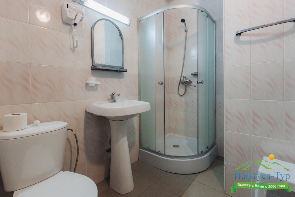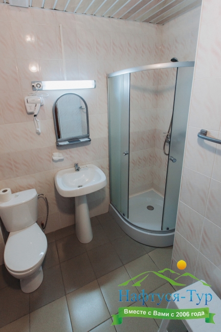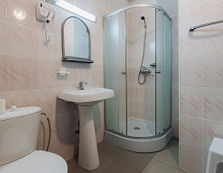 с душевой кабиной, туалетные принадлежности, фен