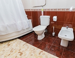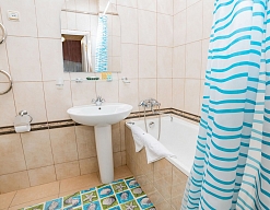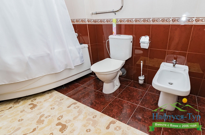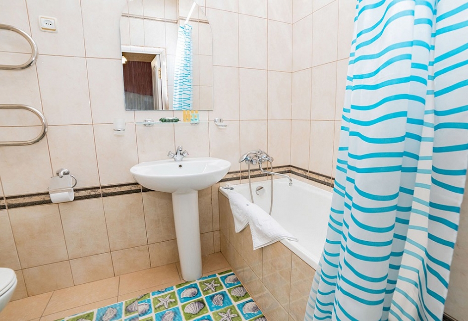 с ванной, тапочки, туалетные принадлежности, фен, халат