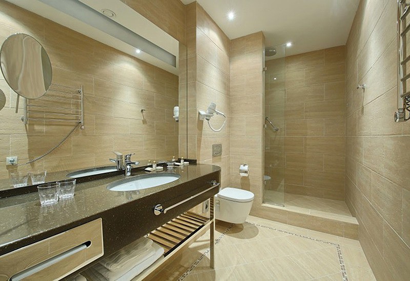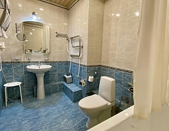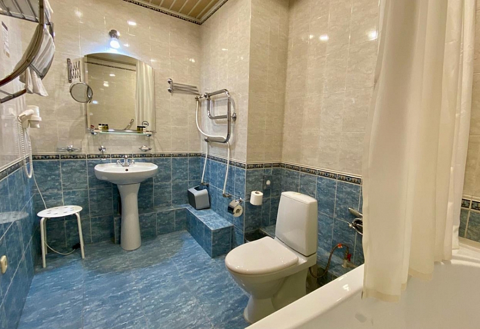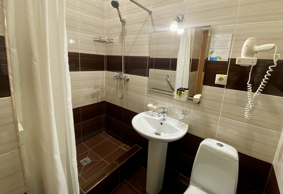 с душем, тапочки, туалетные принадлежности, фен, халат