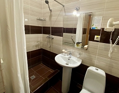 с душевой кабиной, тапочки, туалетные принадлежности, фен, халат