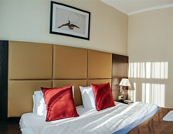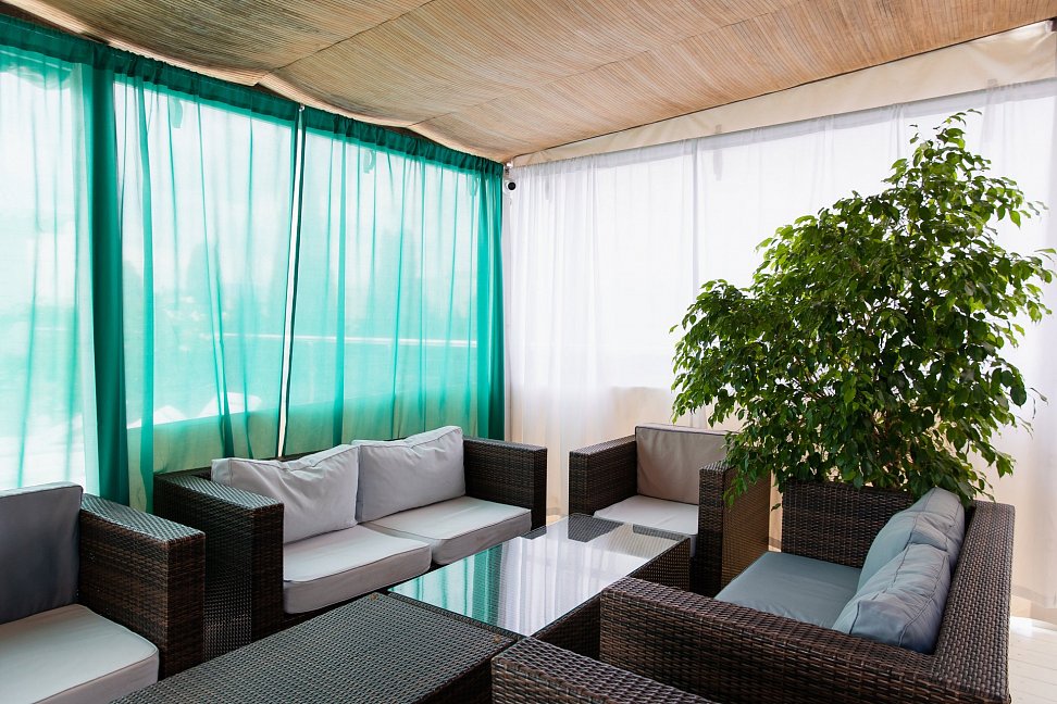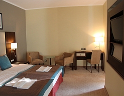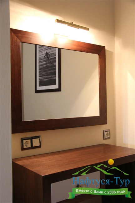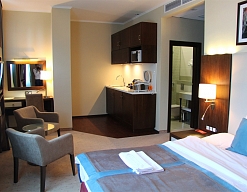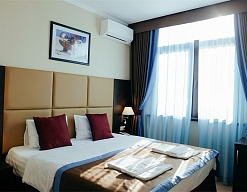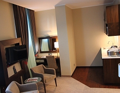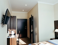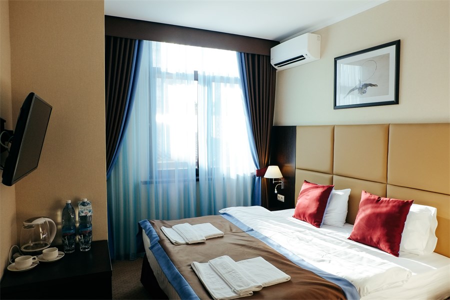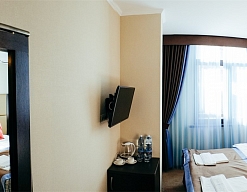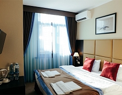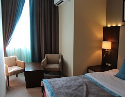 Пятиэтажный корпус отеля располагается на зеленой широкой улице. Жилой фонд, рассчитанный на 70 человек, предлагает отдыхающим номера категории Стандарт и Студии. В комнатах лаконичный современный интерьер, есть все необходимое для комфортного проживания: сплит-система, санузел с душем, плазменный телевизор, кофемашина. В ряде номеров предусмотрены балконы.